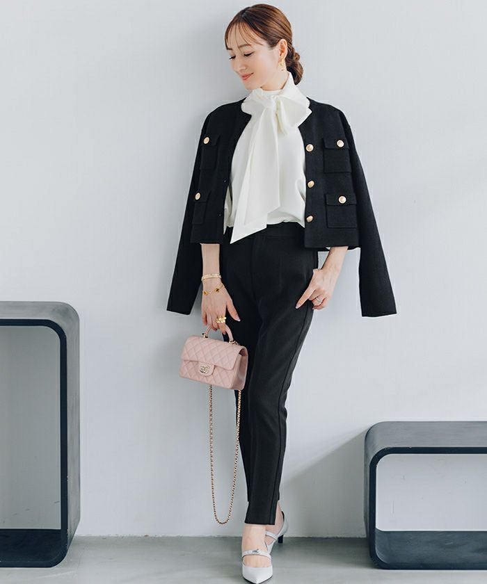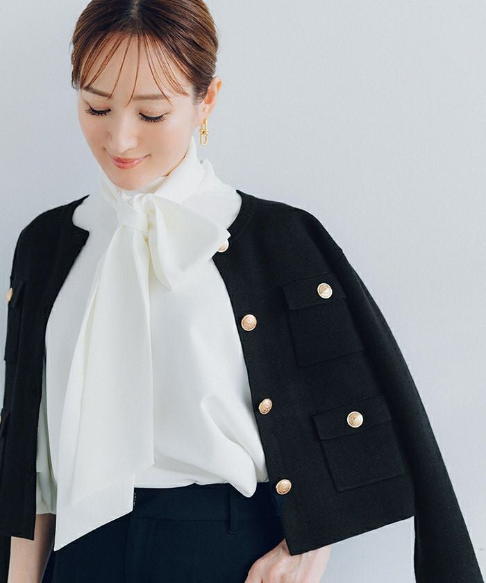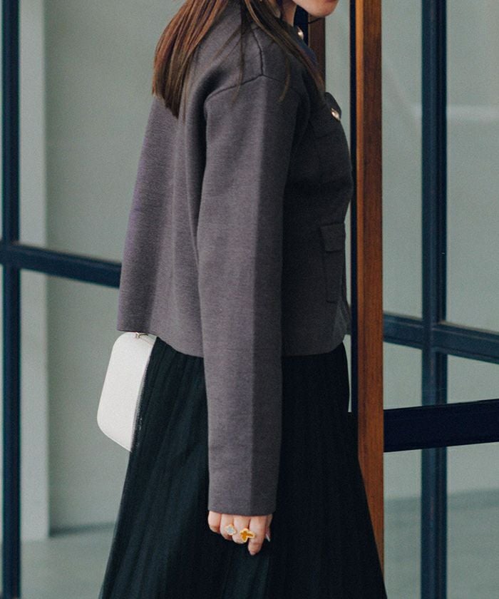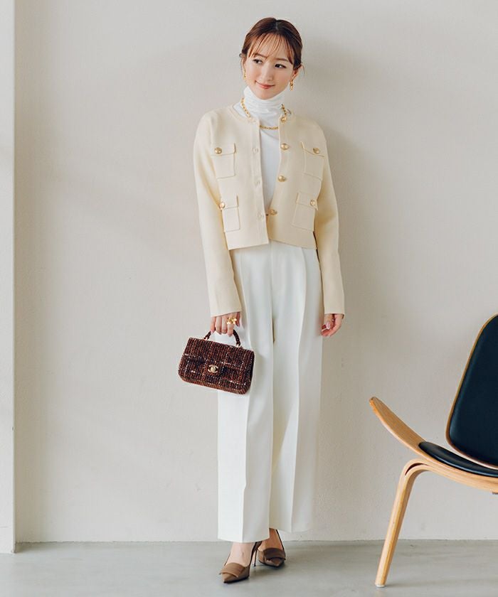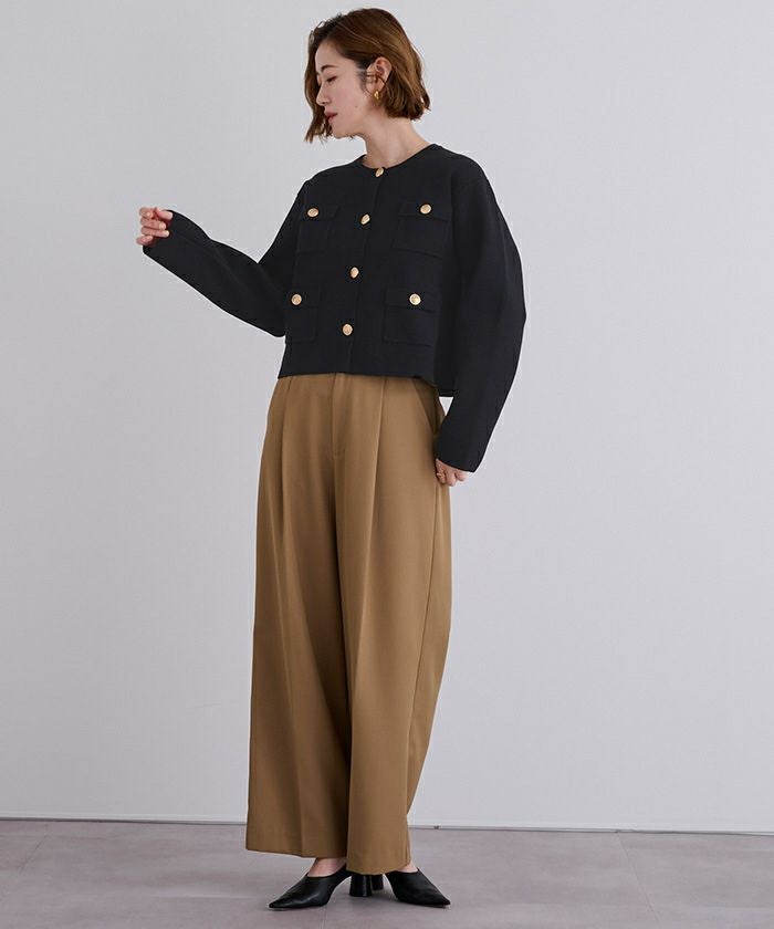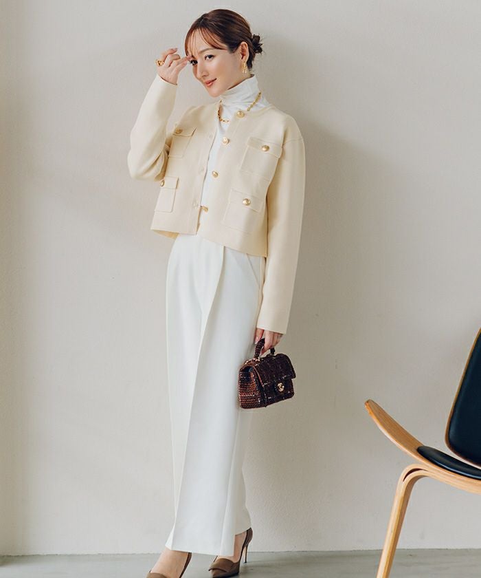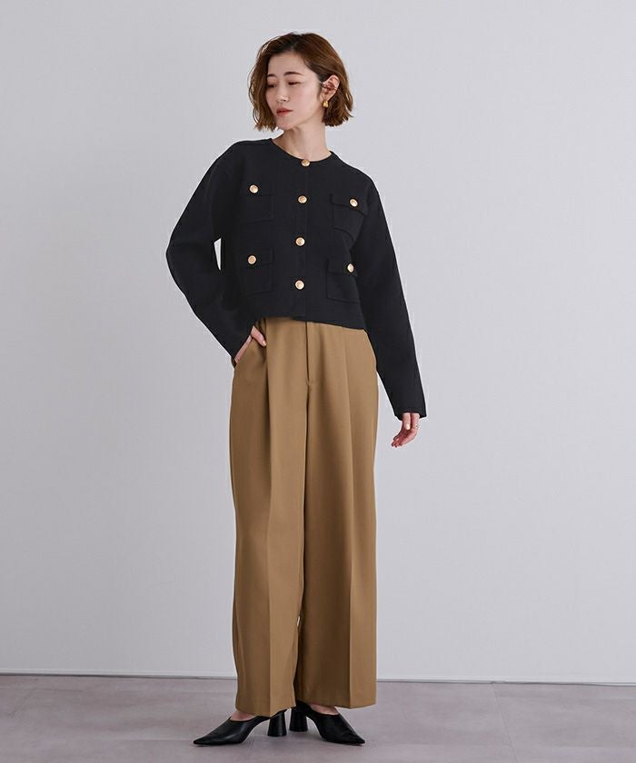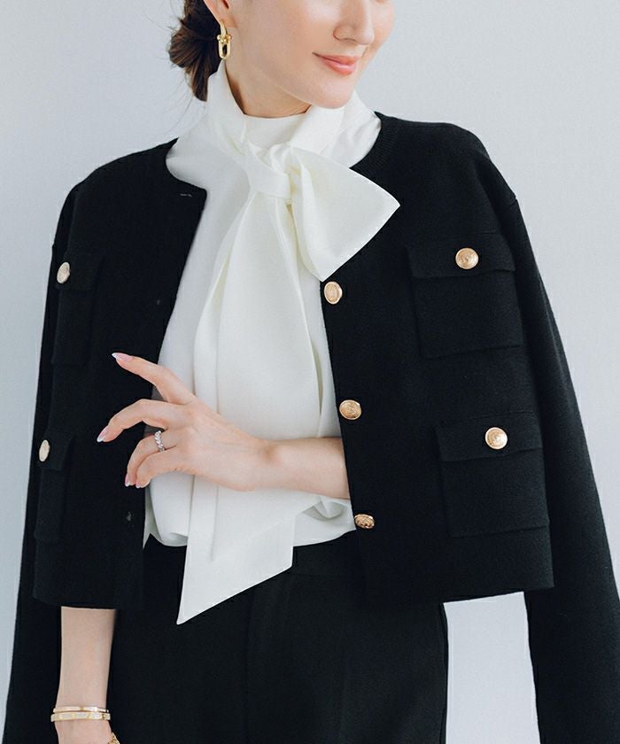 高級感のあるゴールド釦がアクセントのニットカーディガン/ジャケット。
