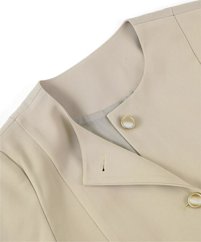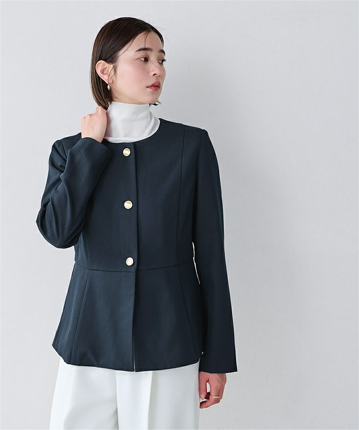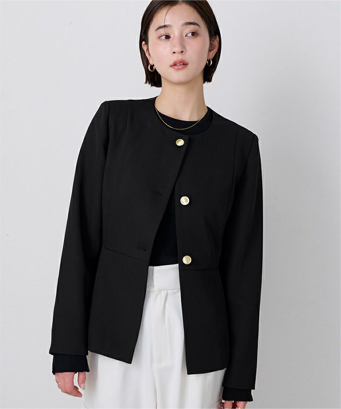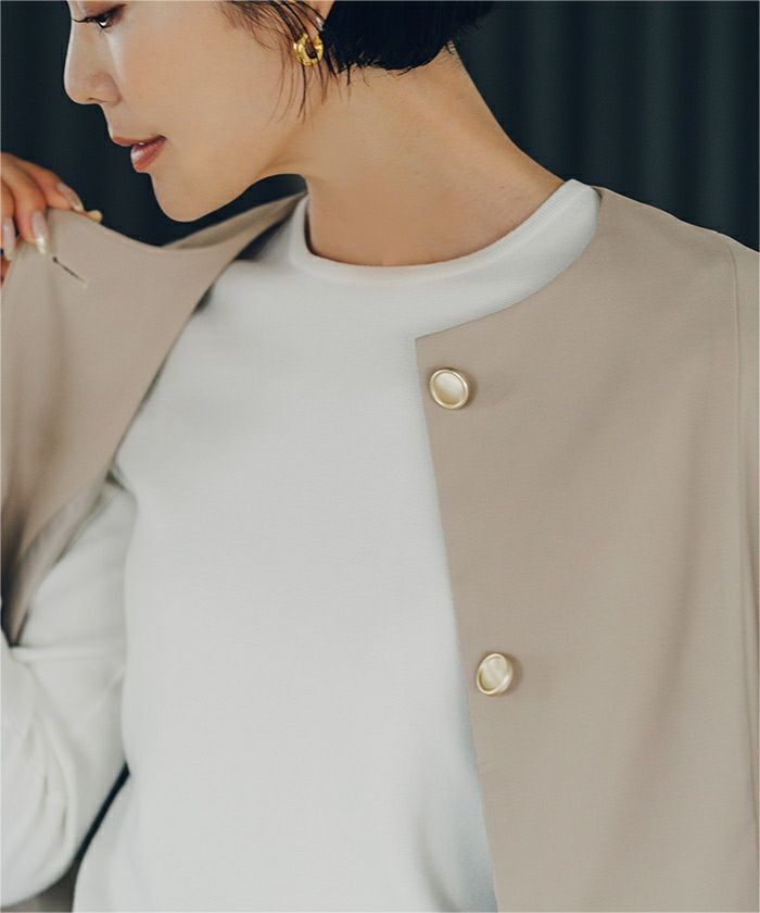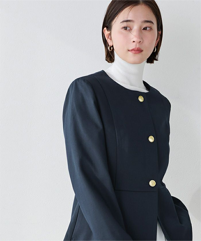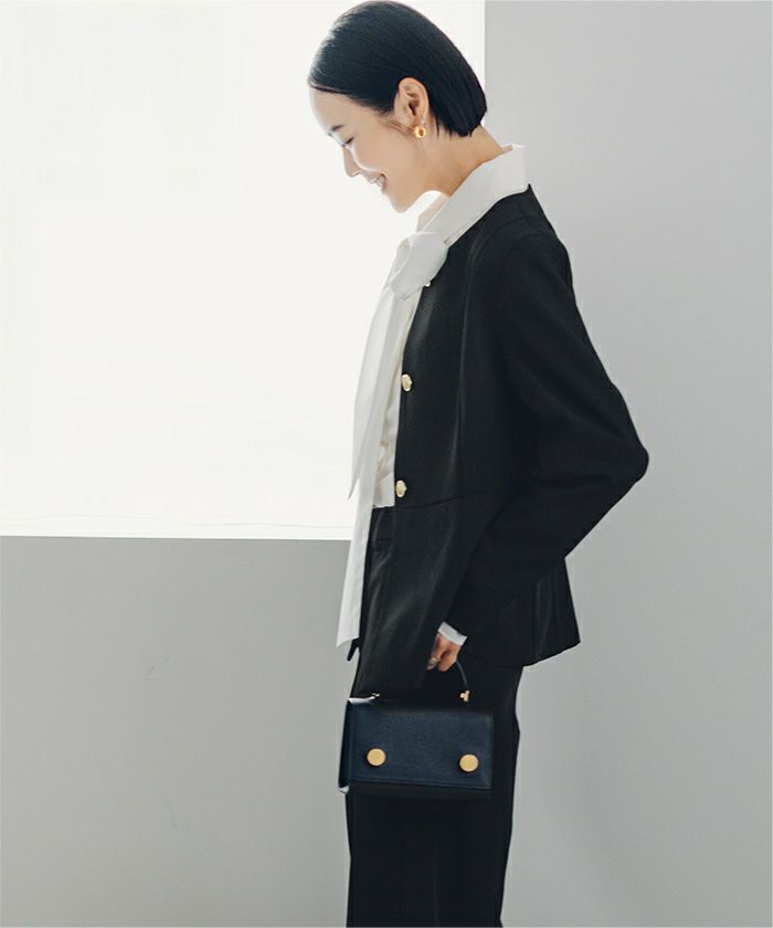 シンプルなデザインに、フロントのゴールド調ボタンが華やかなアクセントを添えます。