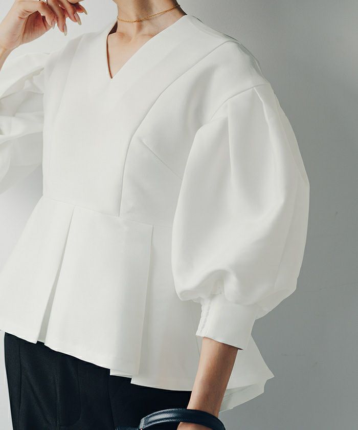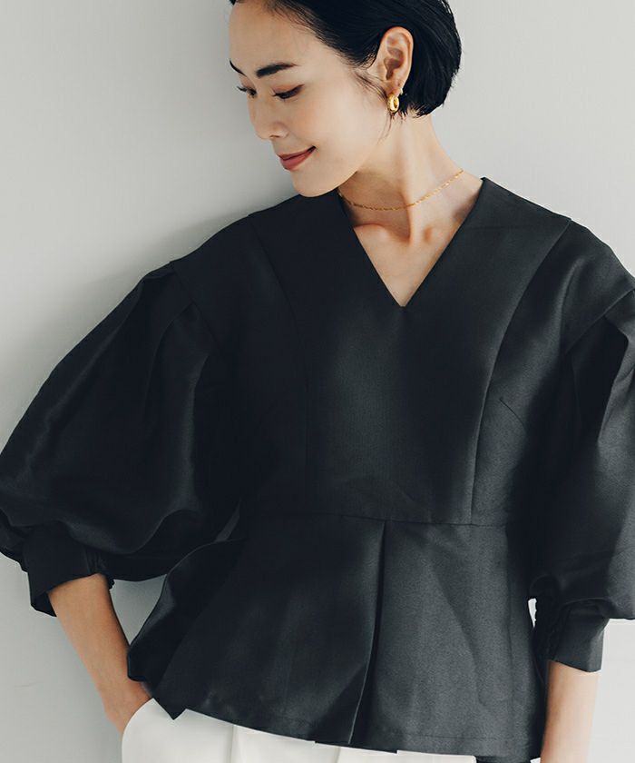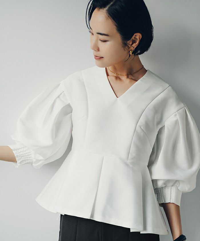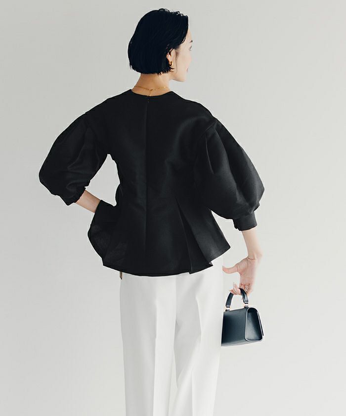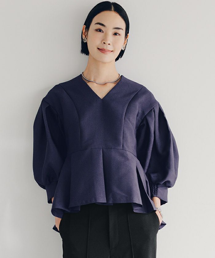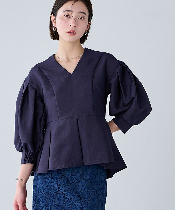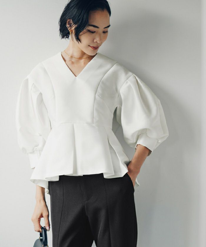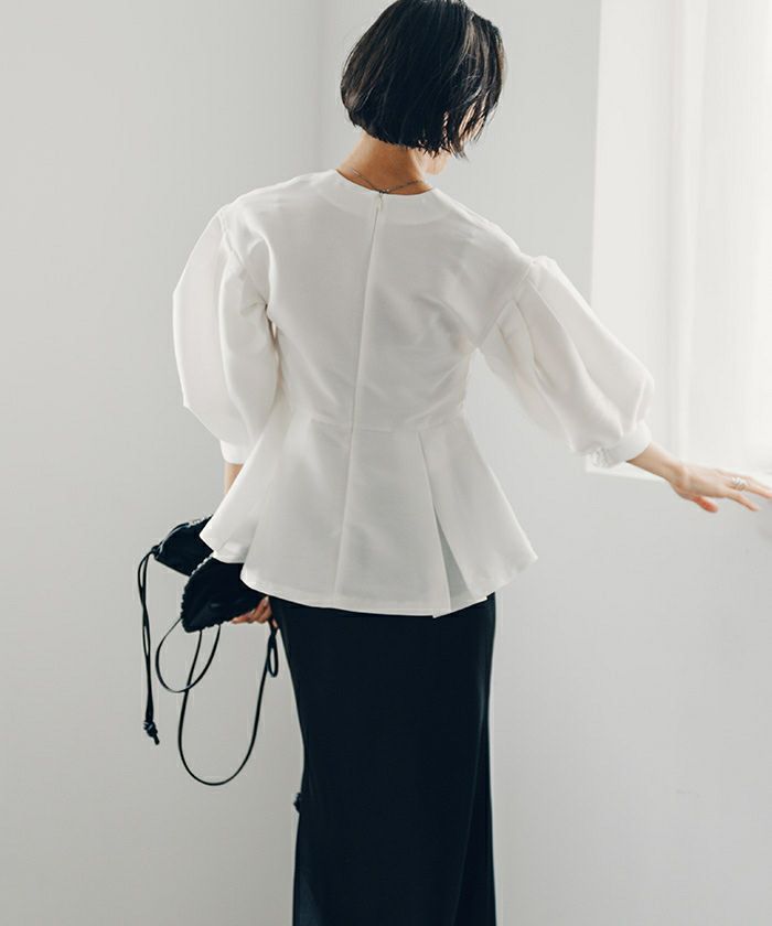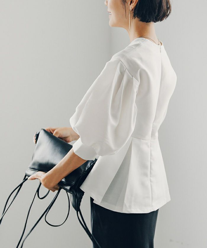 上品な華やかさを引き立てるボリュームスリーブのペプラムブラウス。