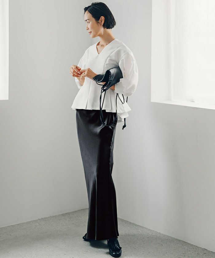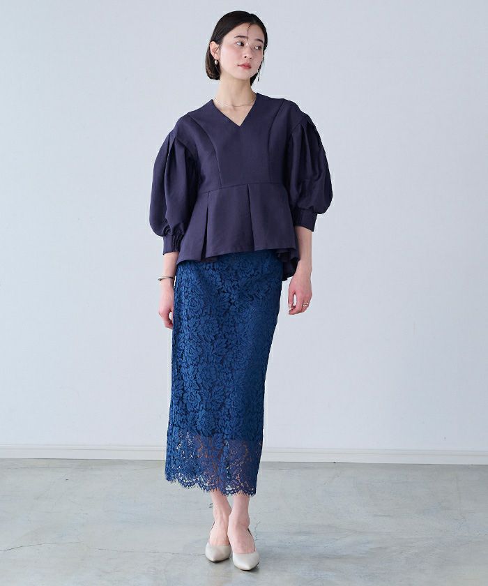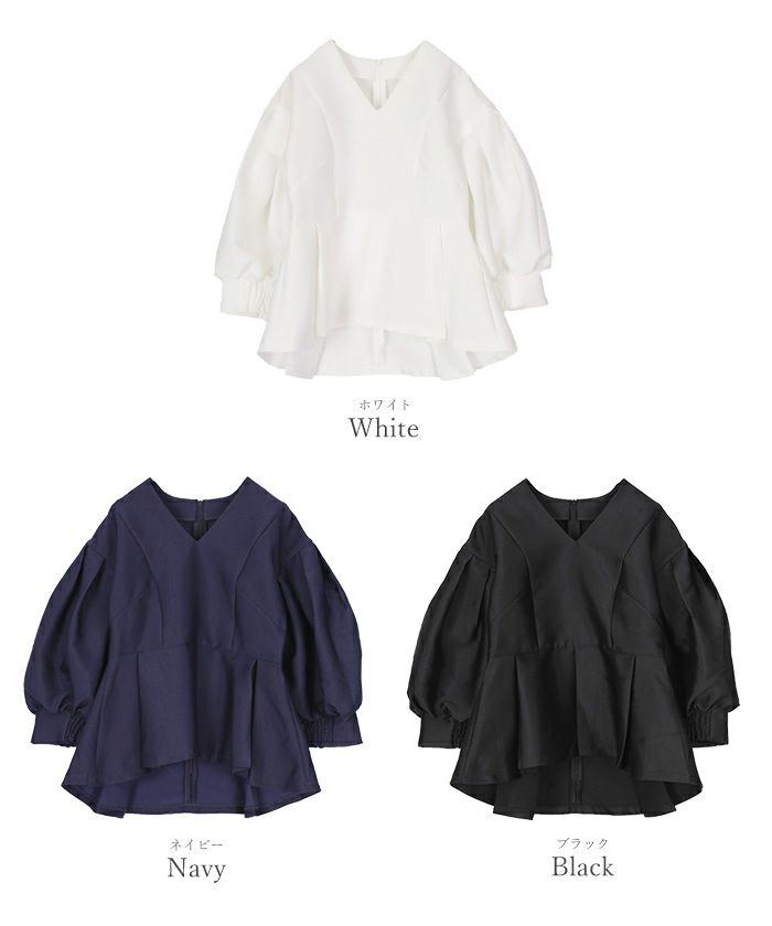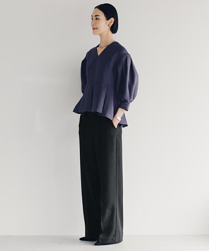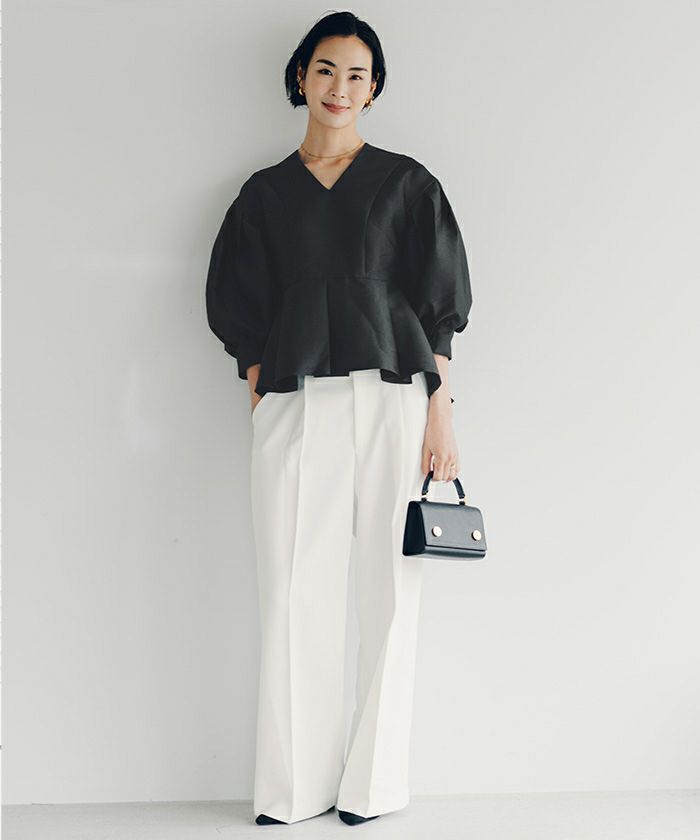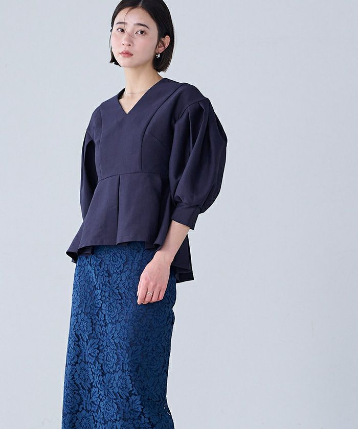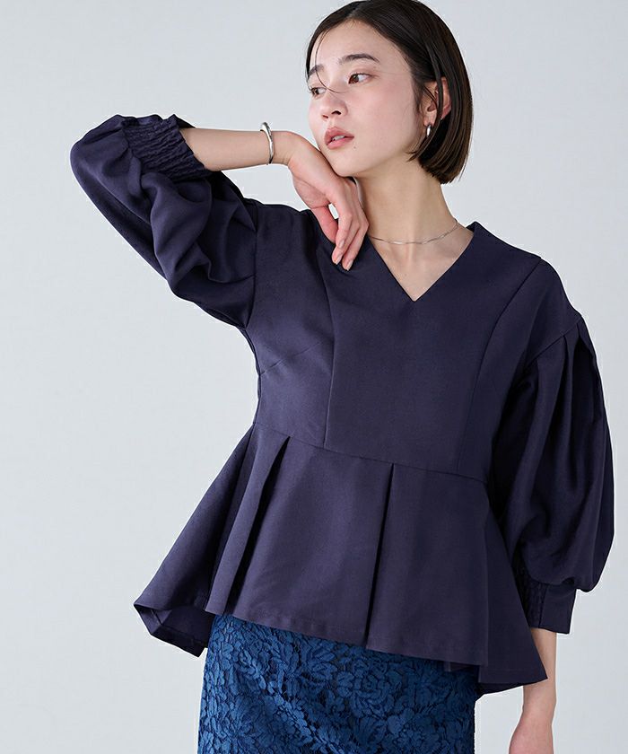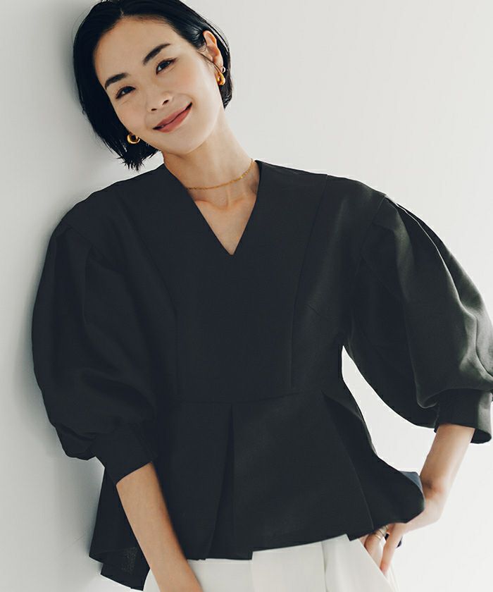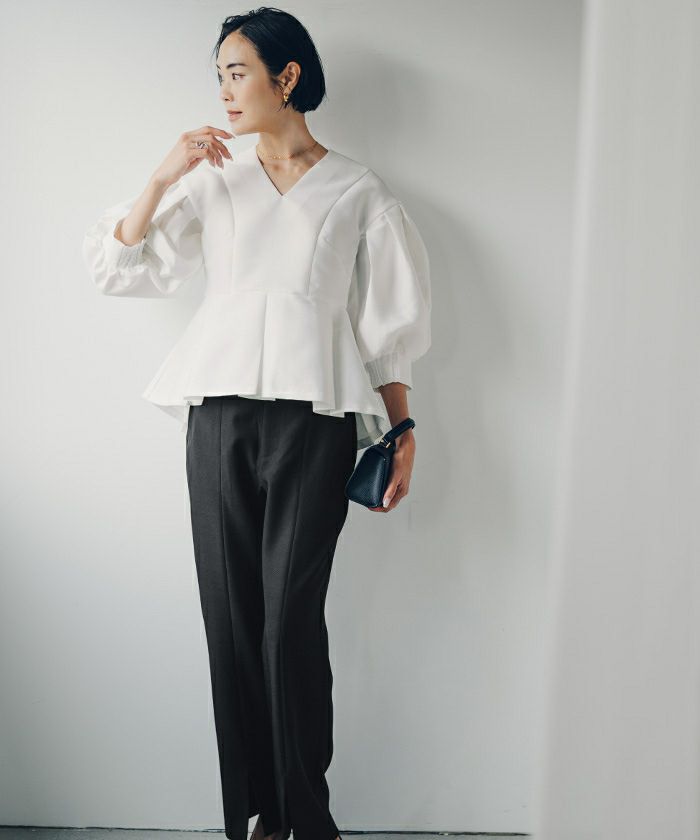 上品な華やかさを引き立てるボリュームスリーブのペプラムブラウス。