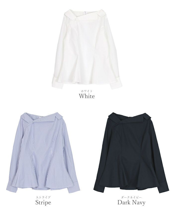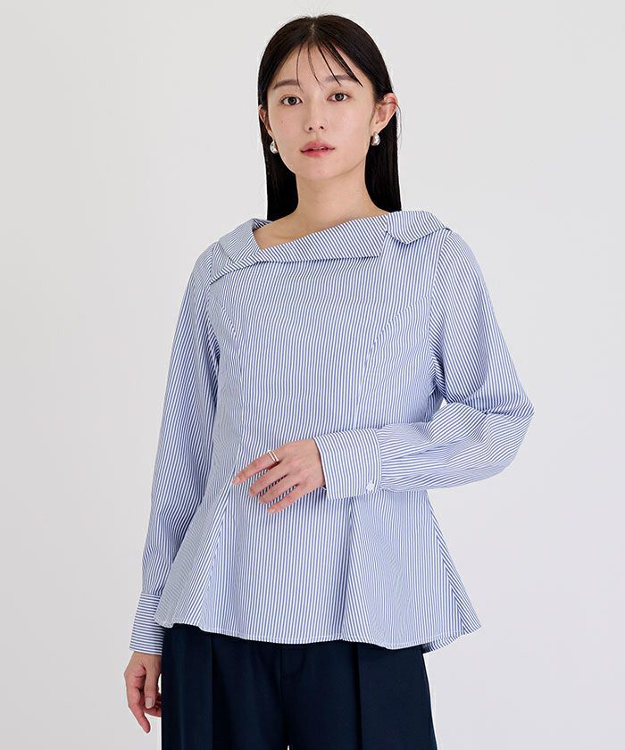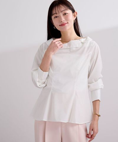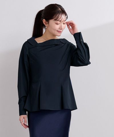 アシンメトリーに仕立てた衿元がデコルテを美しく見せて、女性らしい抜け感をプラス。