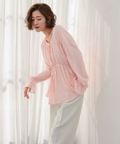 ギャザーをたっぷりと寄せた、ふんわりとしたシルエットのシアーブラウス。