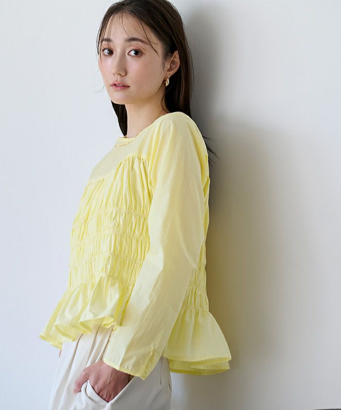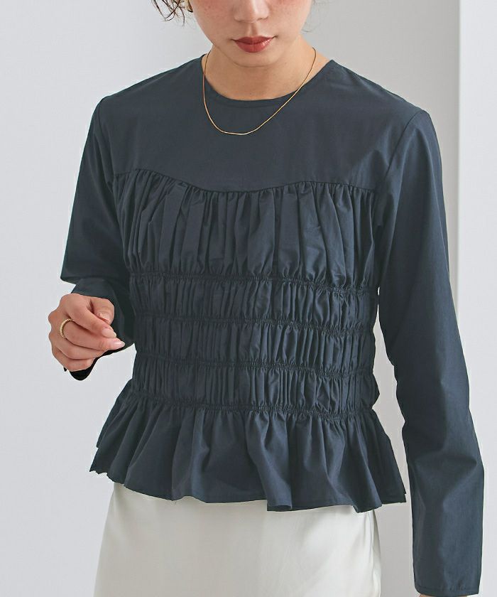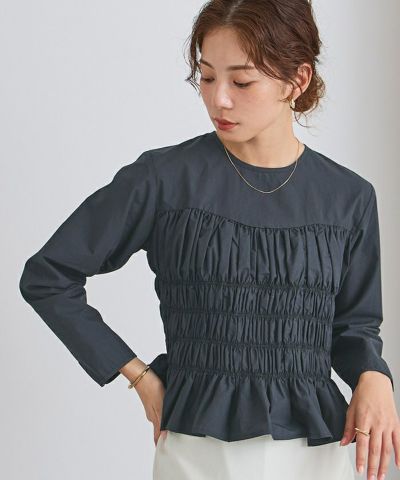 シャーリングがビスチェ風にデザインされた、トレンド感あふれるブラウス。
