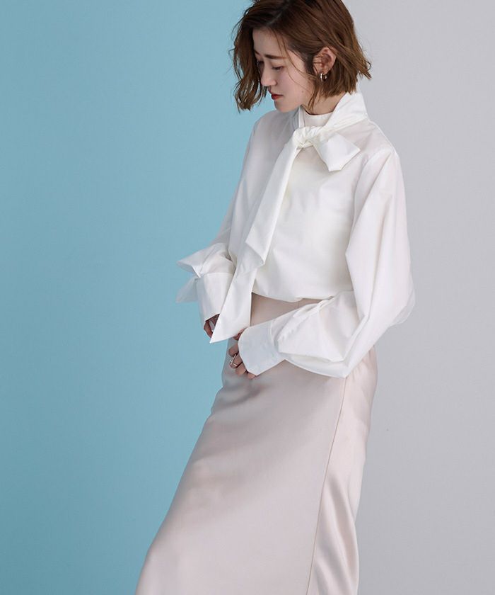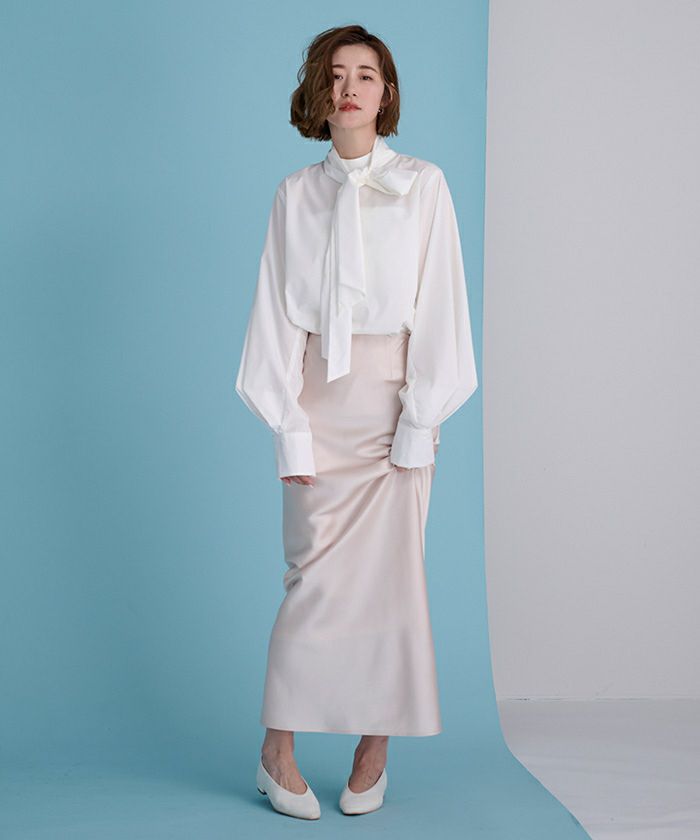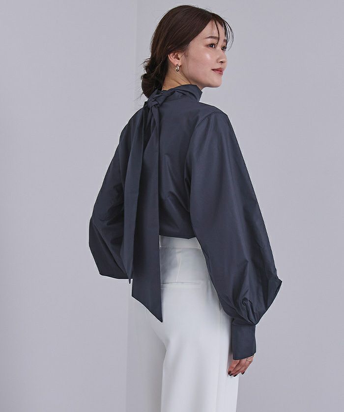 ブラウス自体がハイネックデザインになっており、ボウタイなしでもすっきりと着用いただけます。