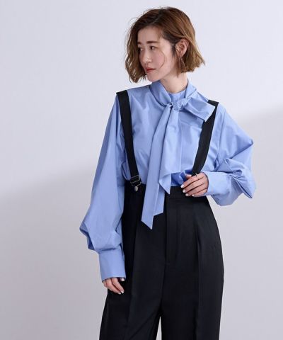 取り外し可能なボウタイが付いた2way仕様のブラウス。