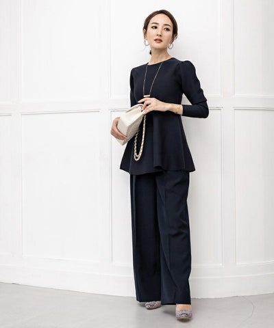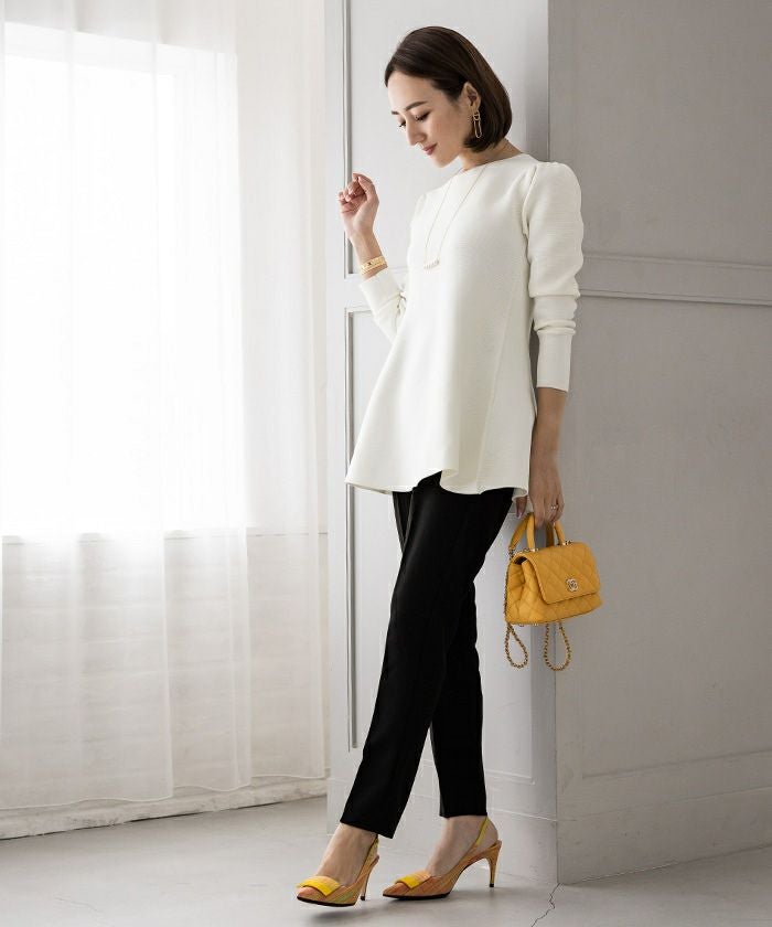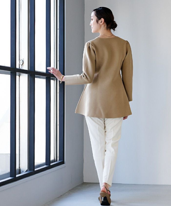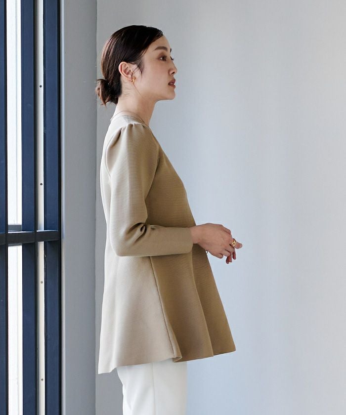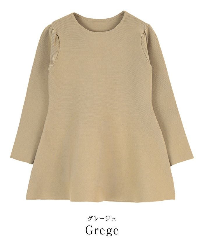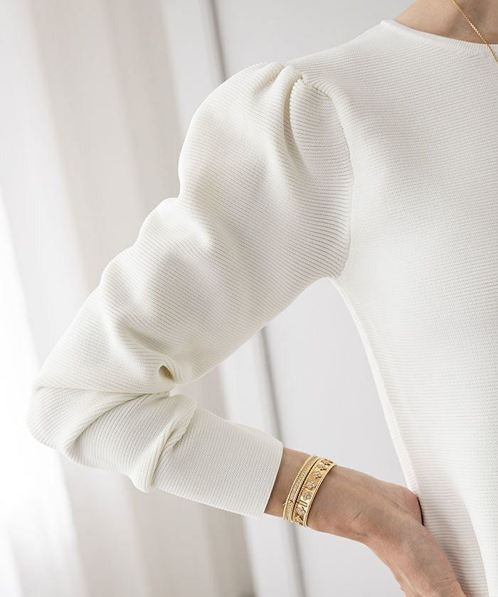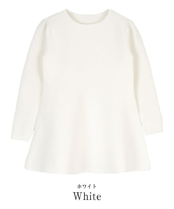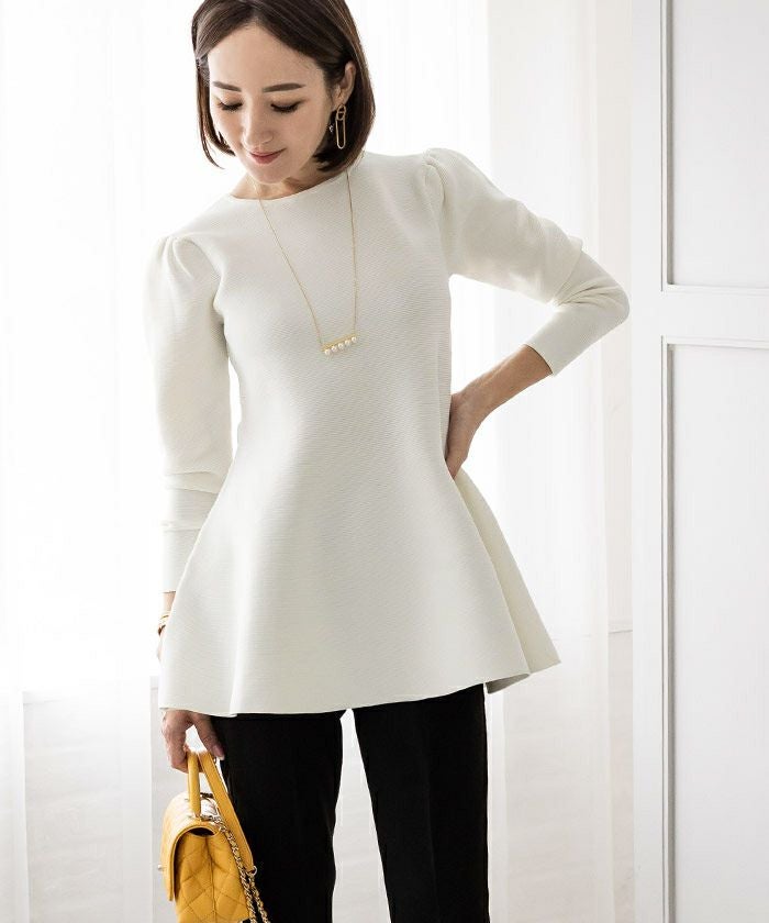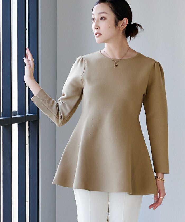 肩周りのぽわんとしたフォルムが大人可愛いパフスリーブペプラムニットトップス。