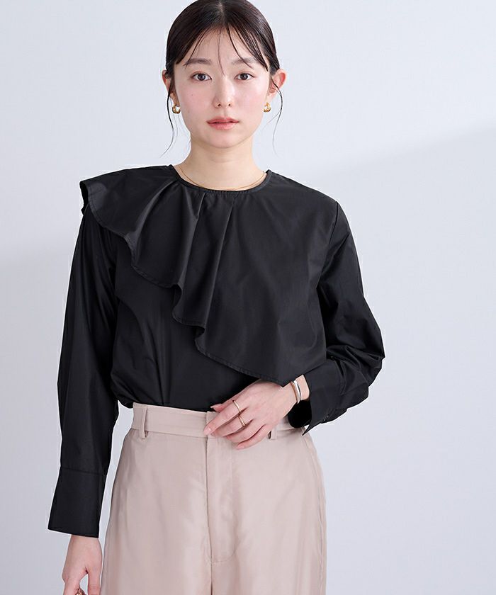 ネックラインにタックを施してふんわりしたラッフルデザインに仕上げました。