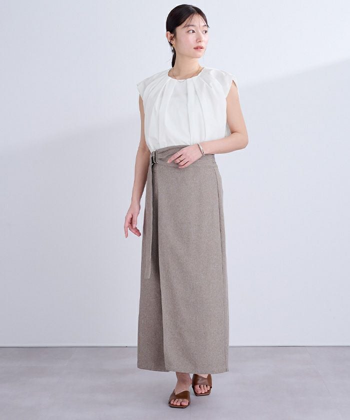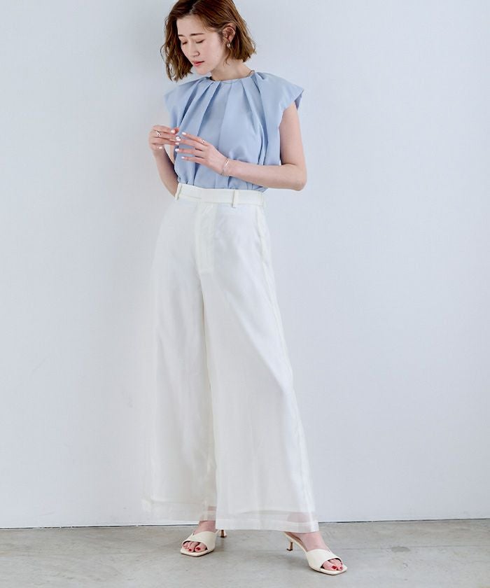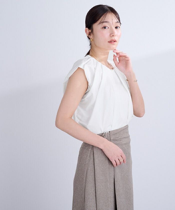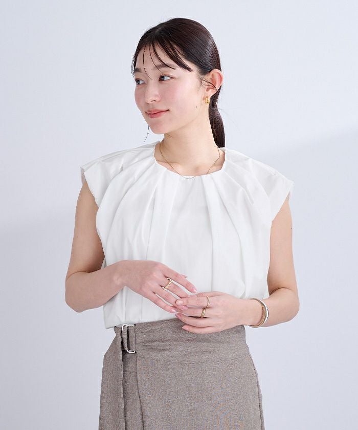 襟ぐりにタックが入っておりふんわりとボリュームのあるトップス。