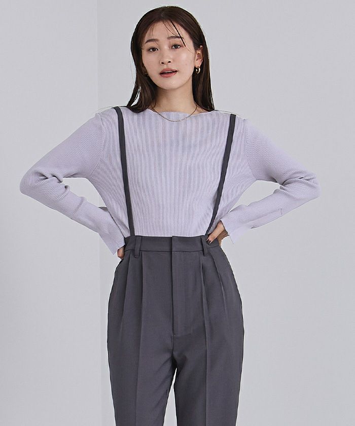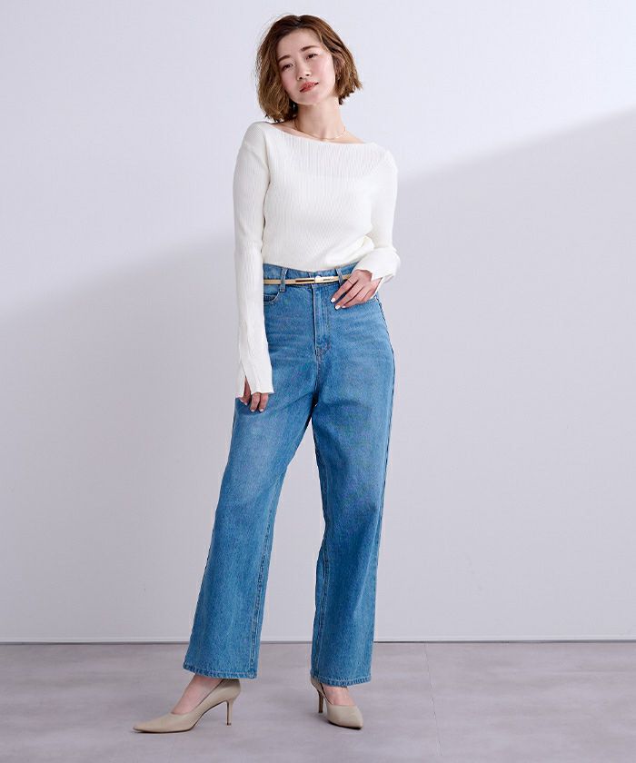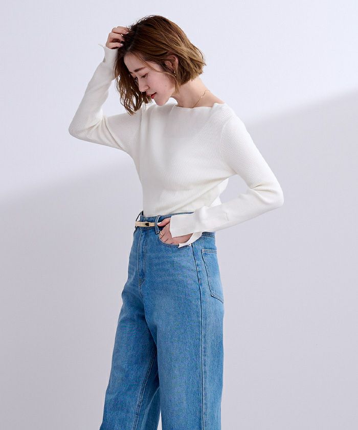 ボートネックでデコルテを綺麗に見せられるシンプルなリブニット。