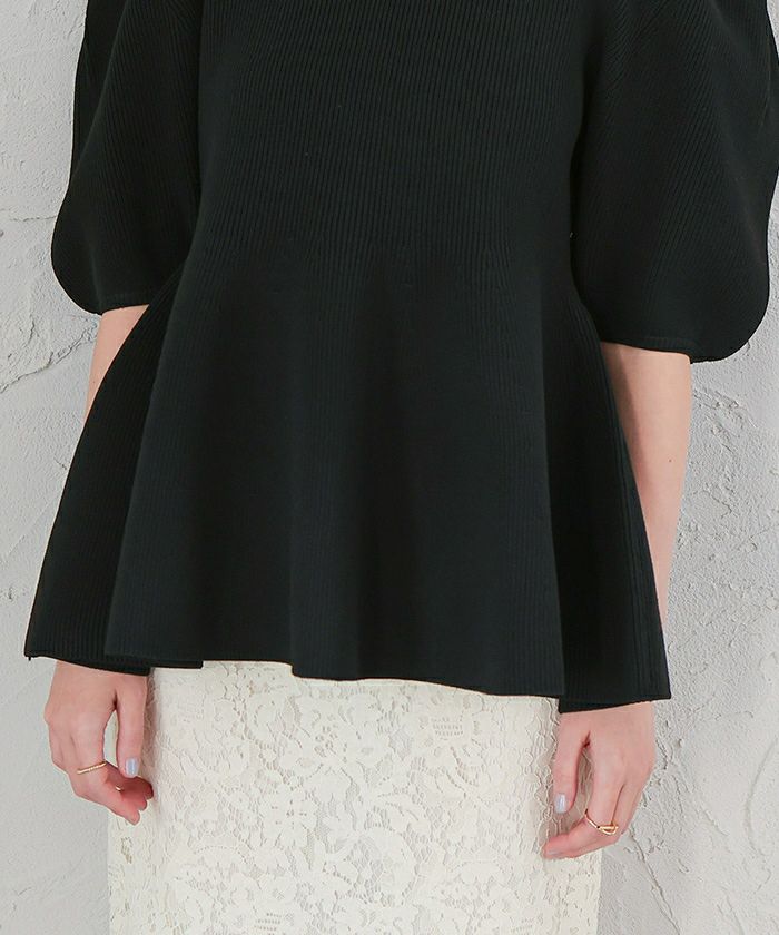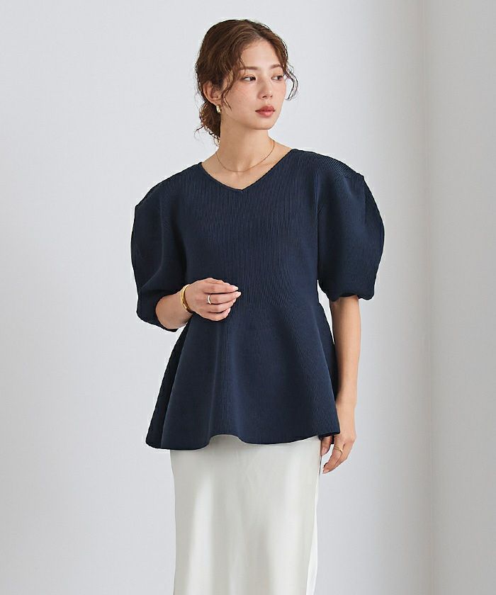 立体的なパフスリーブとフレアシルエットが女性らしさを引き立てるペプラムトップス。