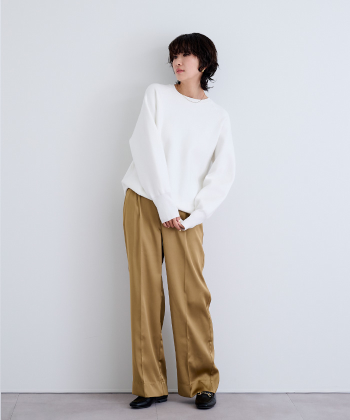 大人カジュアルスタイルにぴったりなスウェット見えするニットトップス。