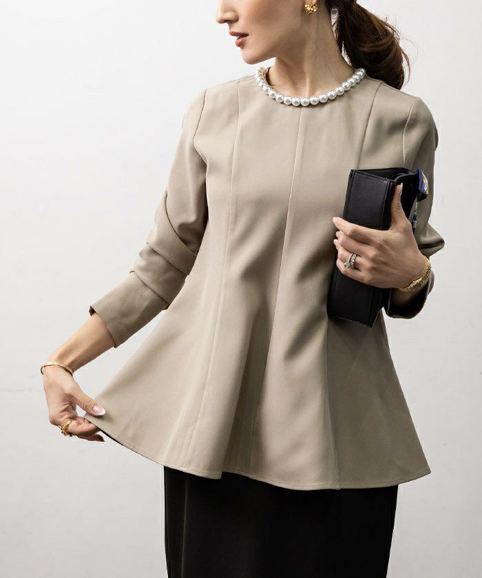 襟元にあしらった大きめのホワイトパールがこだわりのヘムライントップス。