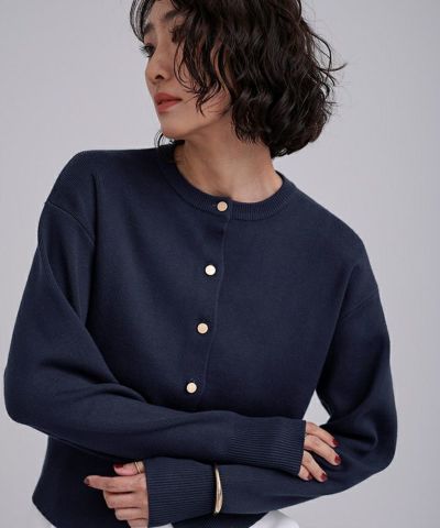 ・マットな質感のメタルボタンがポイントのニットカーディガン。