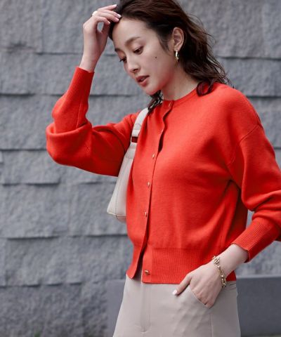 オレンジを購入しました。鮮やかな色合いです。生地が分厚く重たいカーディガンですが、肌寒い日には活躍しました。