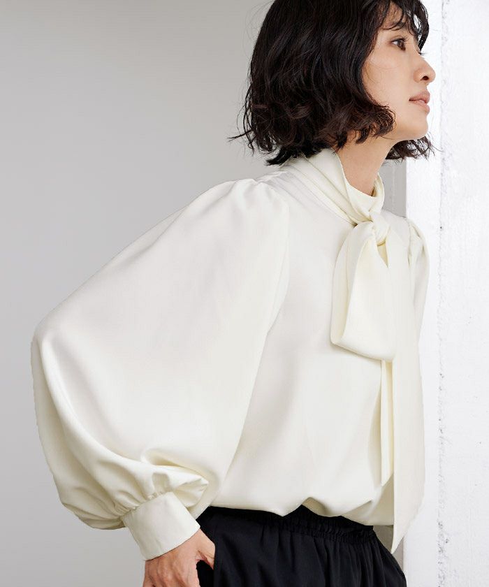 取り外し可能なボウタイ付きのボリュームスリーブブラウス。