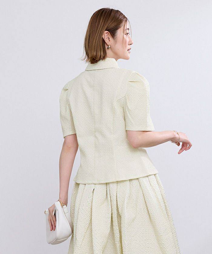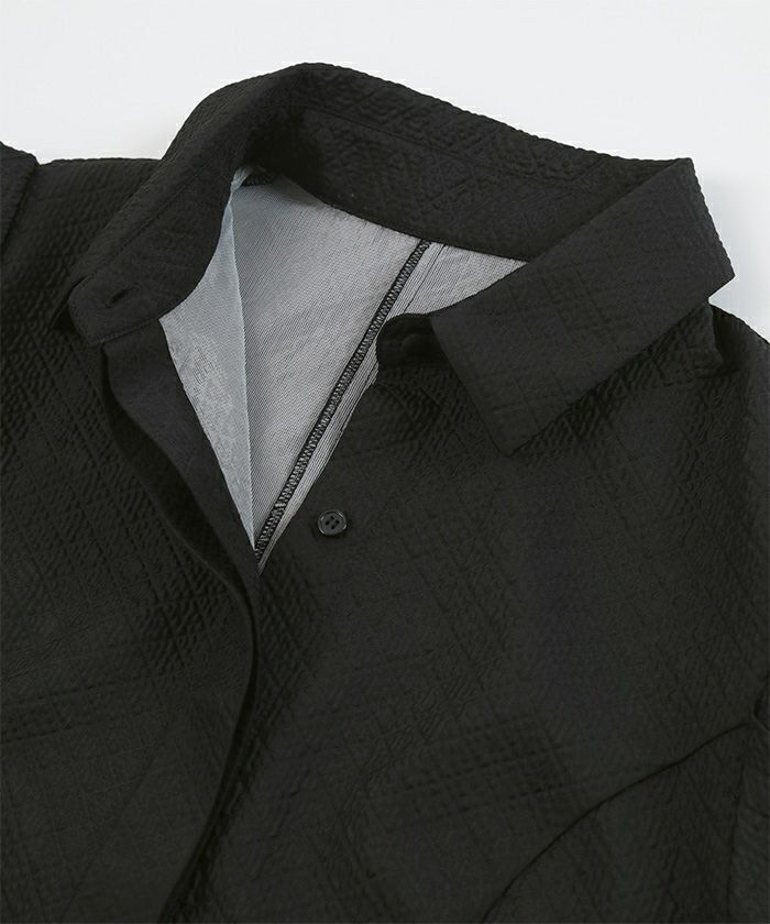 第一釦のみくるみ釦使用する事により、綺麗目な印象に。