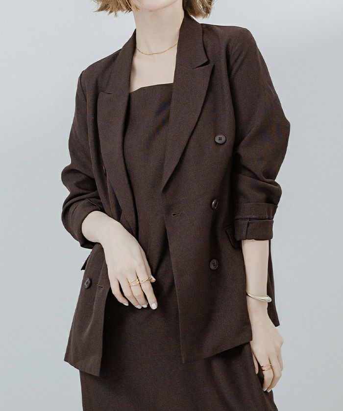 今年らしいピークドラペルのシャープなラインのダブルブレストジャケット。