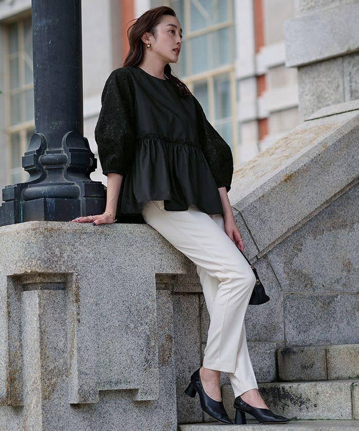 身頃はシャツ生地でペプラムデザインが華やかな印象に。