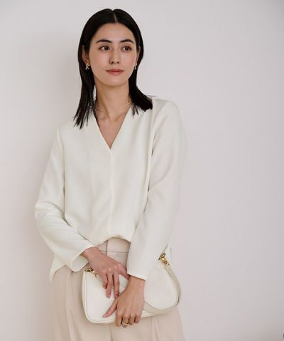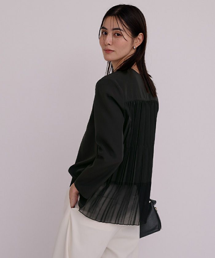 163センチ47キロMサイズ…ネイビー Vネックで女性らしい華奢なブラウス! バックスタイルのプリーツがキレイです。ピップまわりが気になる私にはプリーツが自然と隠れるので嬉しい!