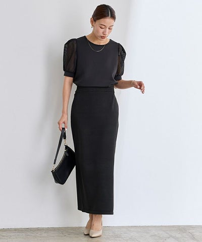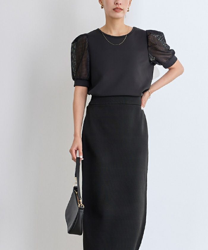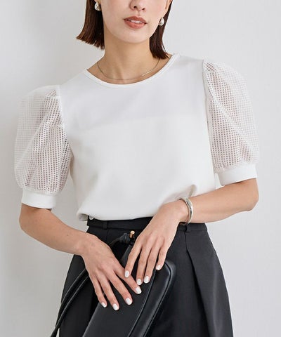 異素材ドッキングのパフスリーブプルオーバー。
