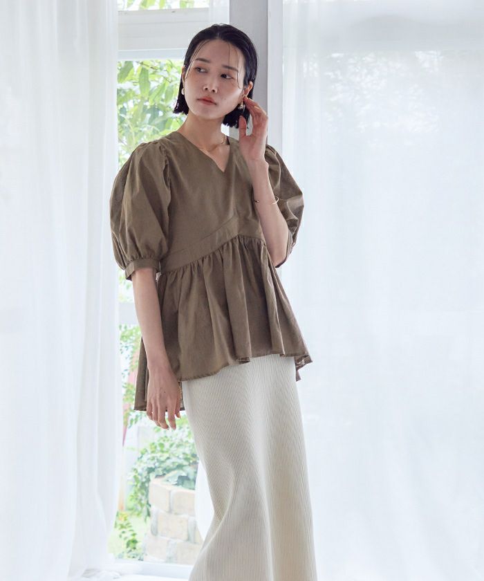 コットンペプラムVネックブラウス