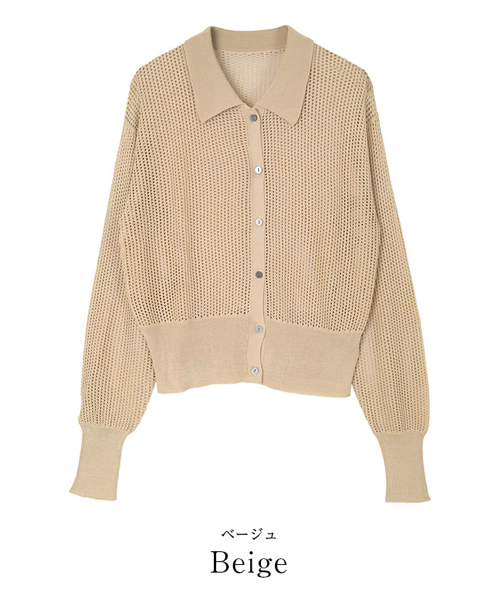 ・カジュアルな印象のメッシュアイテムを襟付きのカーディガンに仕上げて、