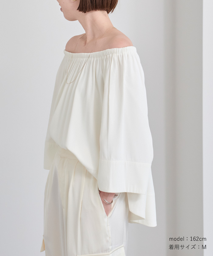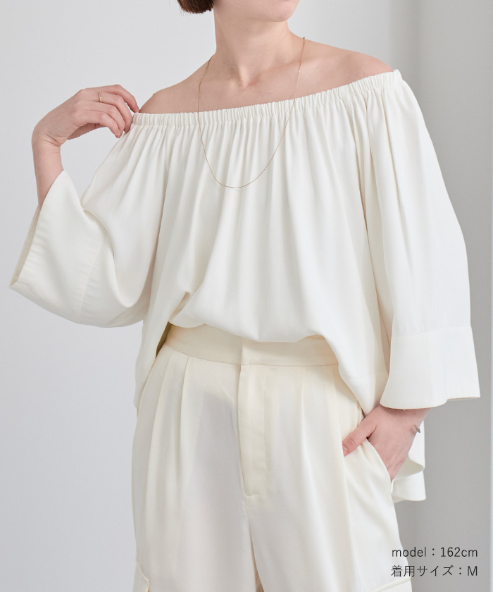 ゴム入りのネックで、ボートネックでもオフショルでも着て頂けます。