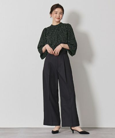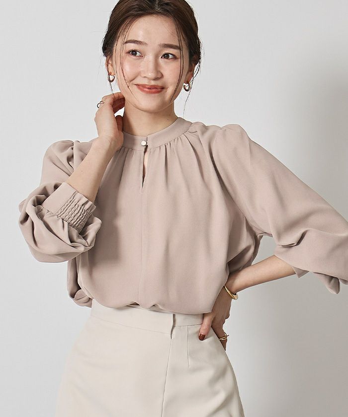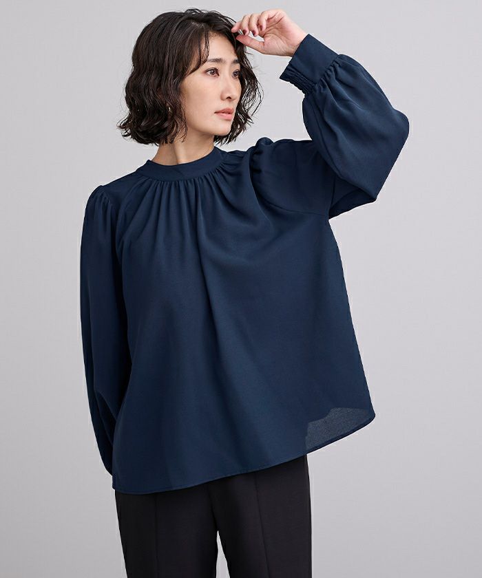 胸元のギャザーが女性らしい華やかさを演出し、ふんわりとしたパフスリーブが可愛らしい印象をプラス。