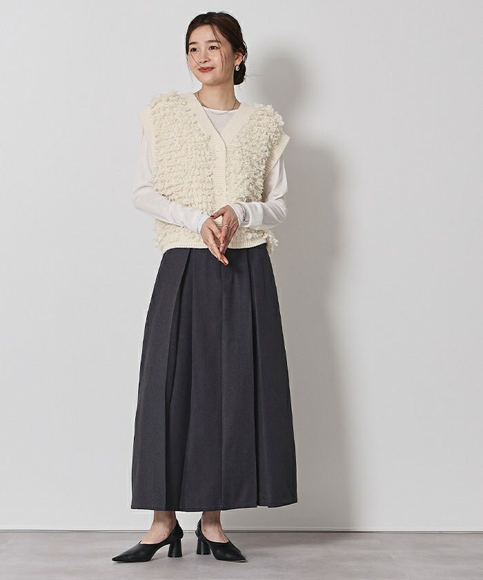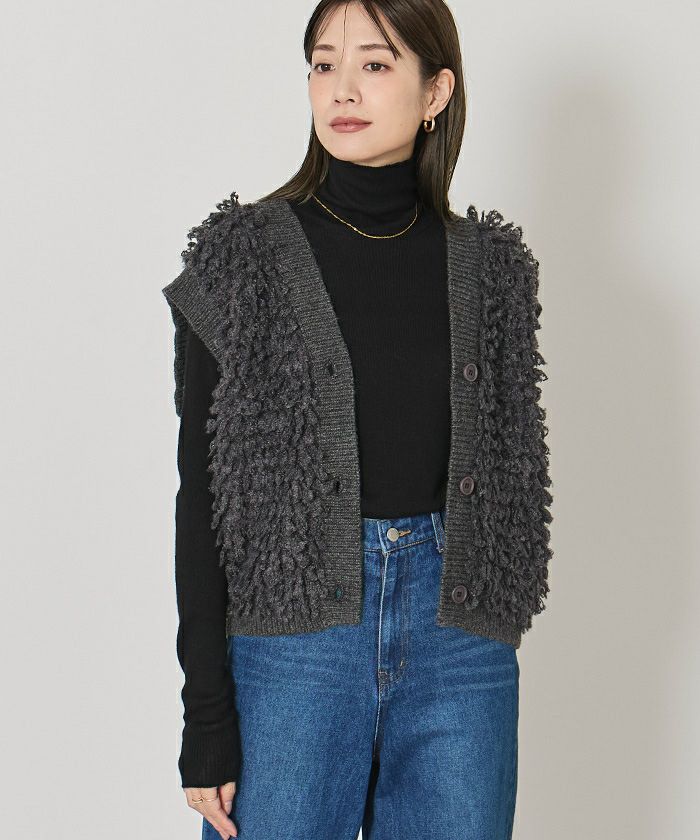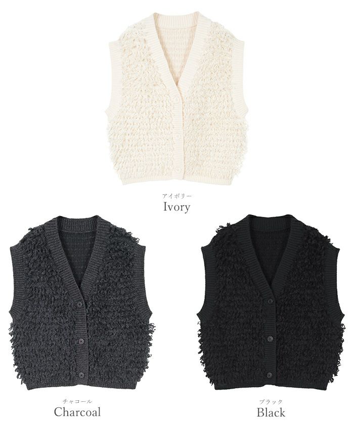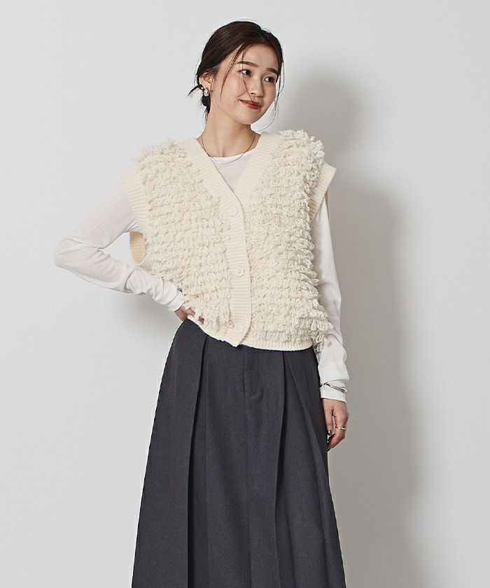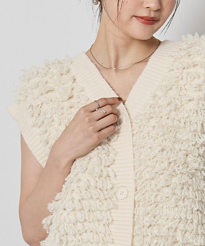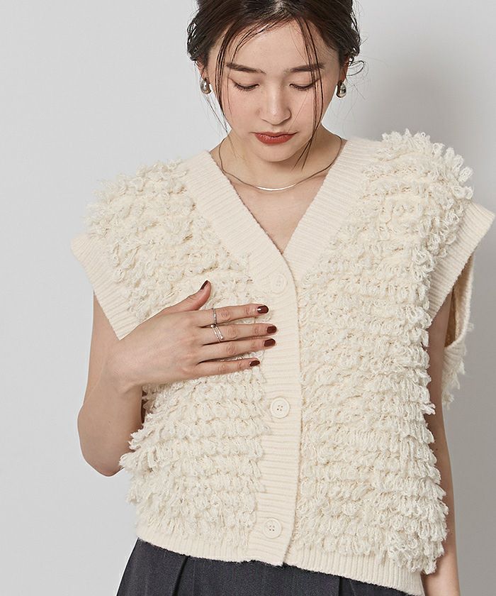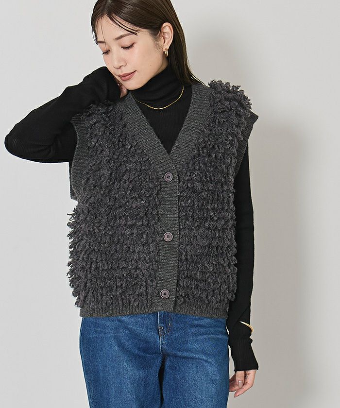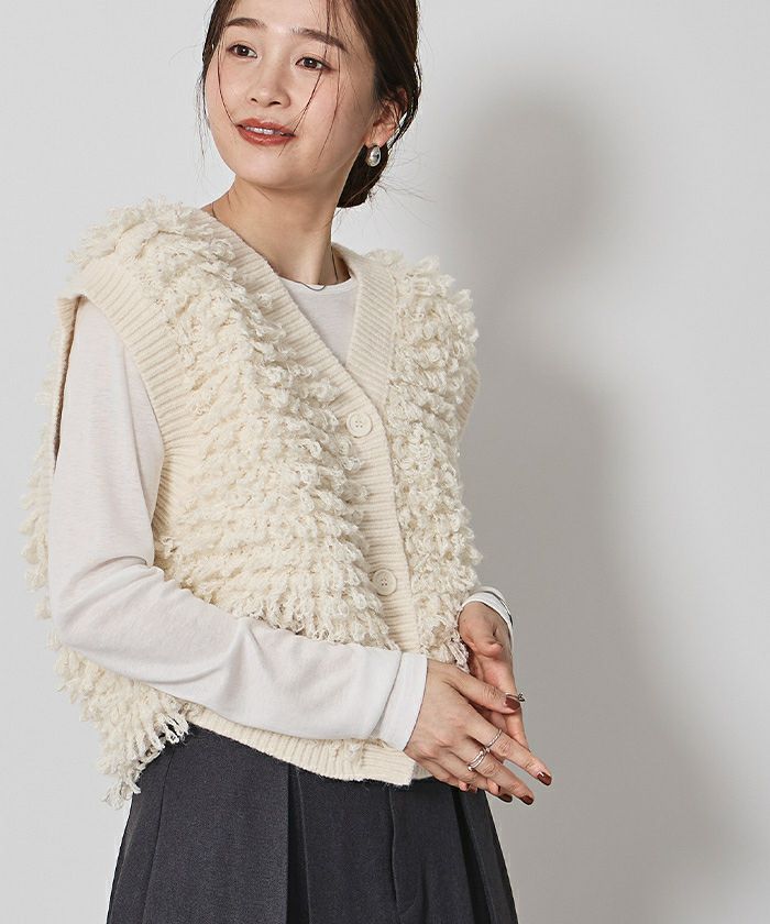 ふんわりとしたループ編みの網目がポイントのニットベスト。程よい厚みで着ぶくれしにくく、すっきりとしたVネックデザインが顔まわりをシャープに見せてくれます。
