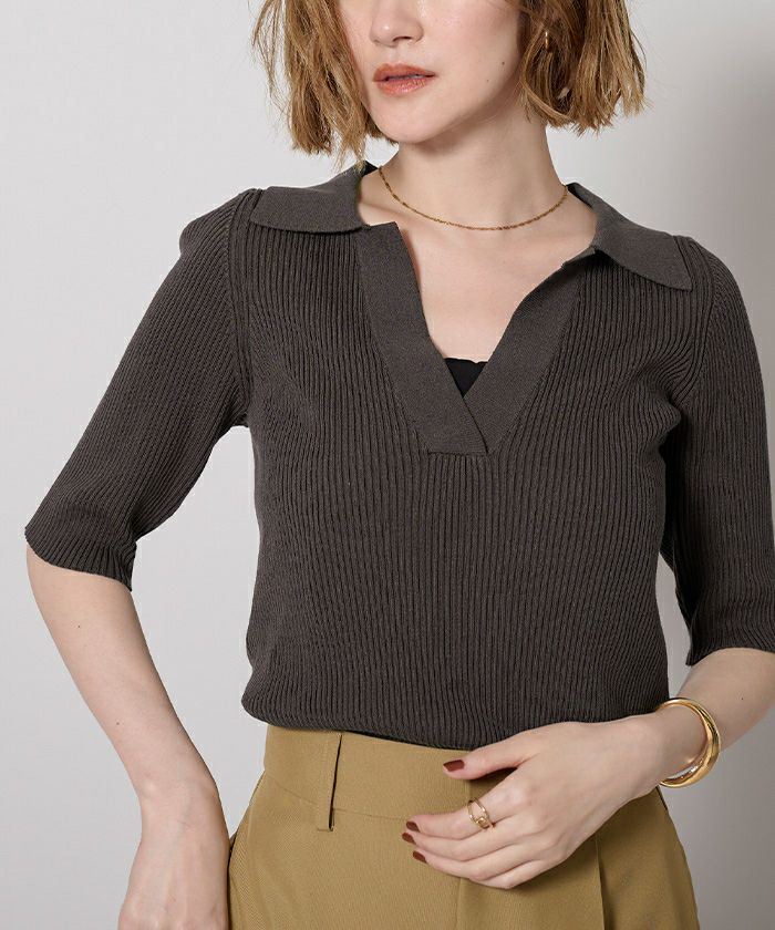 女性らしさ引き立つ、深めスキッパーデザインのポロニット