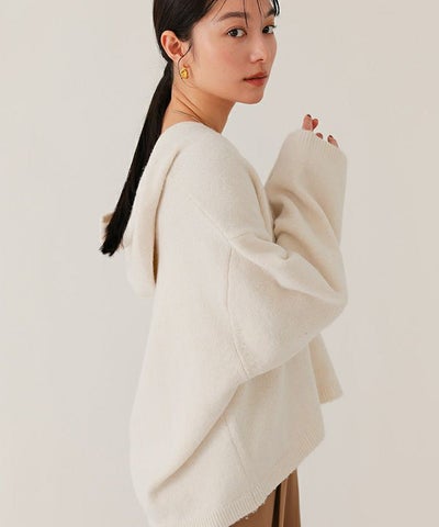 抜け感のある深めのVネックで、1枚ではもちろんインナーとのレイヤードも楽しめます。トレンドのフード付きがデザインが、女性らしさとカジュアルな雰囲気をバランスよく演出。ゆったりとしたシルエットで、リラックス感と今っぽさを演出。着る人の体型を選ばず、華奢見えも叶えるシルエットです。