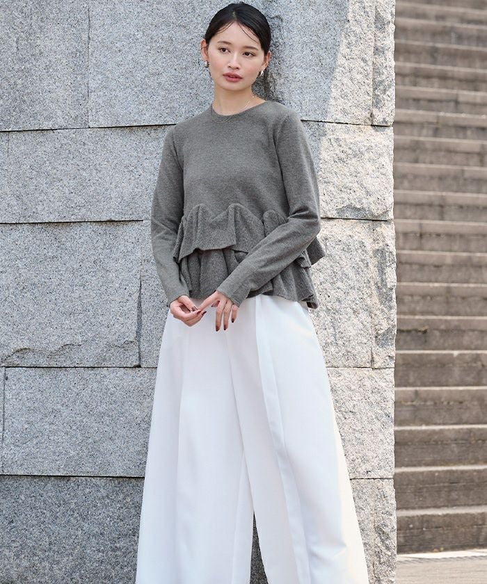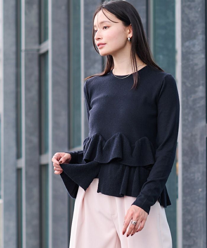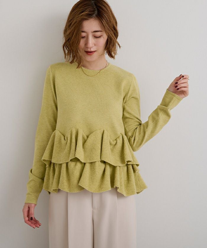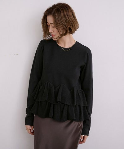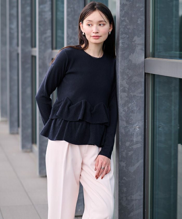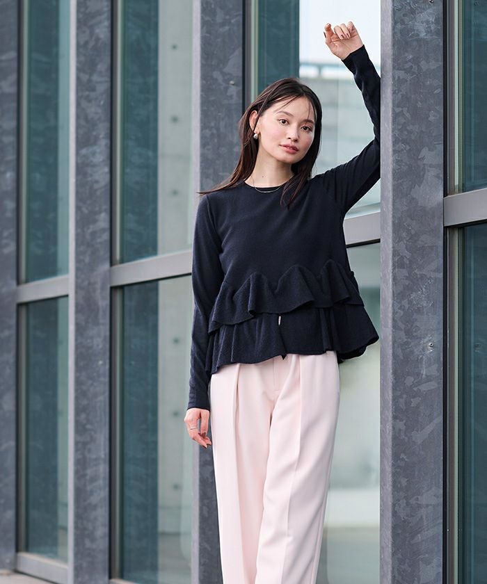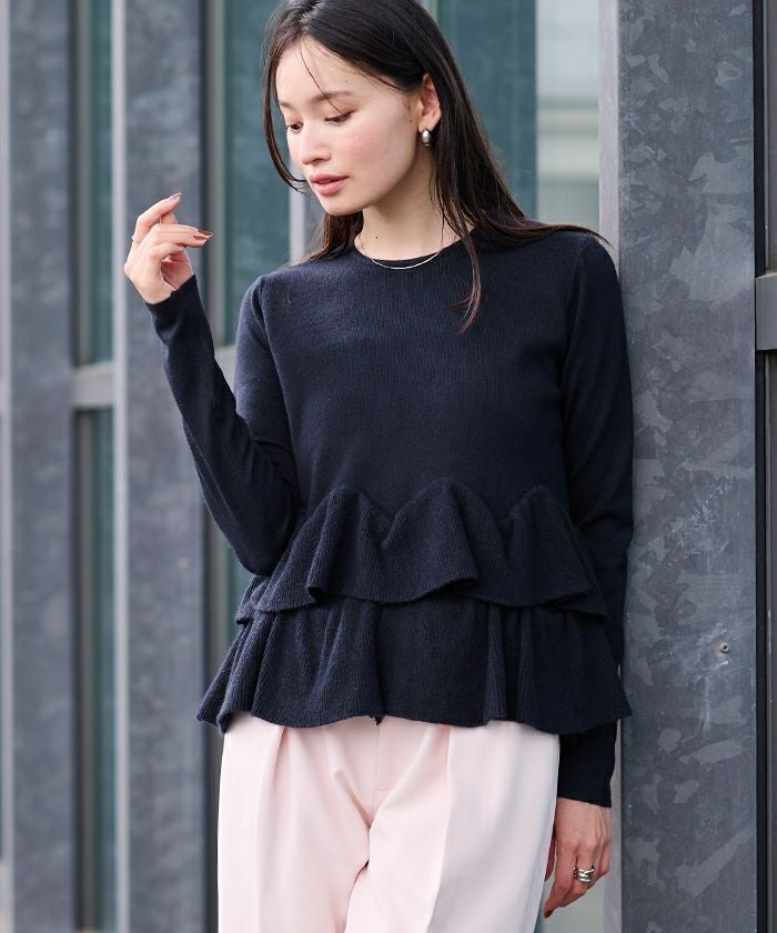 ウエストから裾にかけて施された2段のティアードフリルが、大人可愛いスタイルを演出します。バストや袖まわりはほどよくフィットし、すっきりとしたシルエットに。柔らかなニット素材で着心地も快適。通勤やオフィスカジュアルにもおすすめの一枚です。