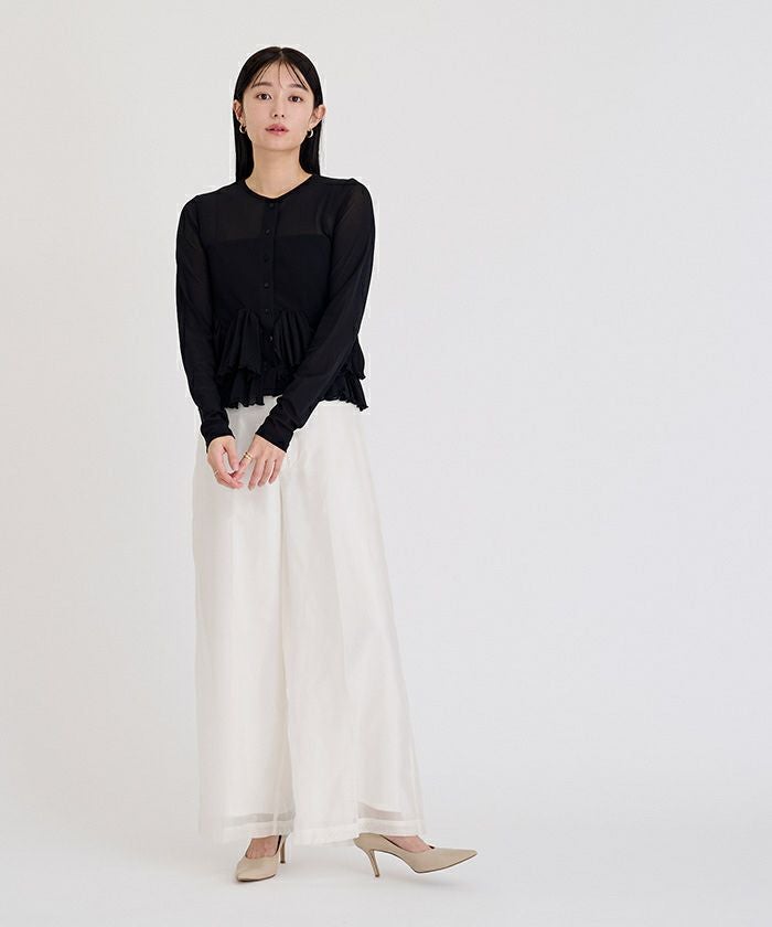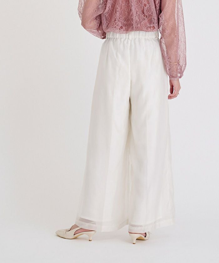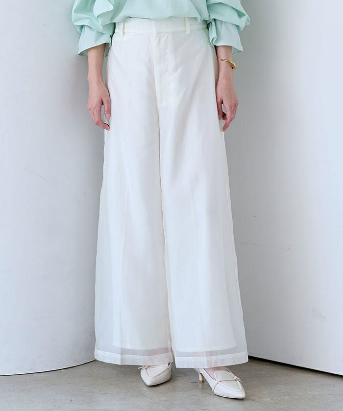 シアーと光沢感ある素材を重ねた、奥行きのある表情が魅力のワイドパンツ。