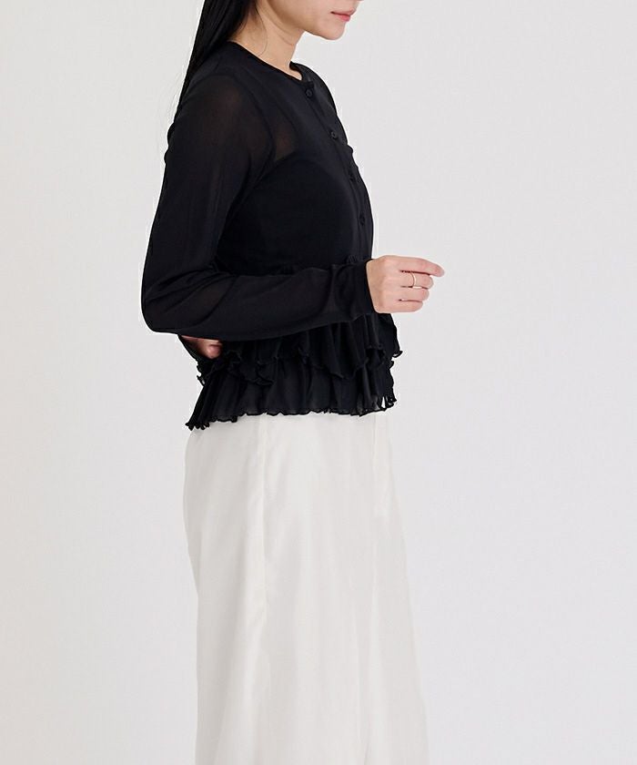 軽やかな透け感が抜け感を演出しつつ、サテンの艶がさりげなく華やかさをプラス。