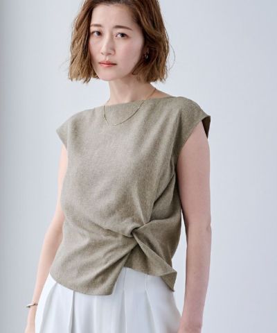 夏にうれしい機能性を備えた〈シャーベットリネンライク〉生地で仕上げた、ウエスト絞りブラウス。