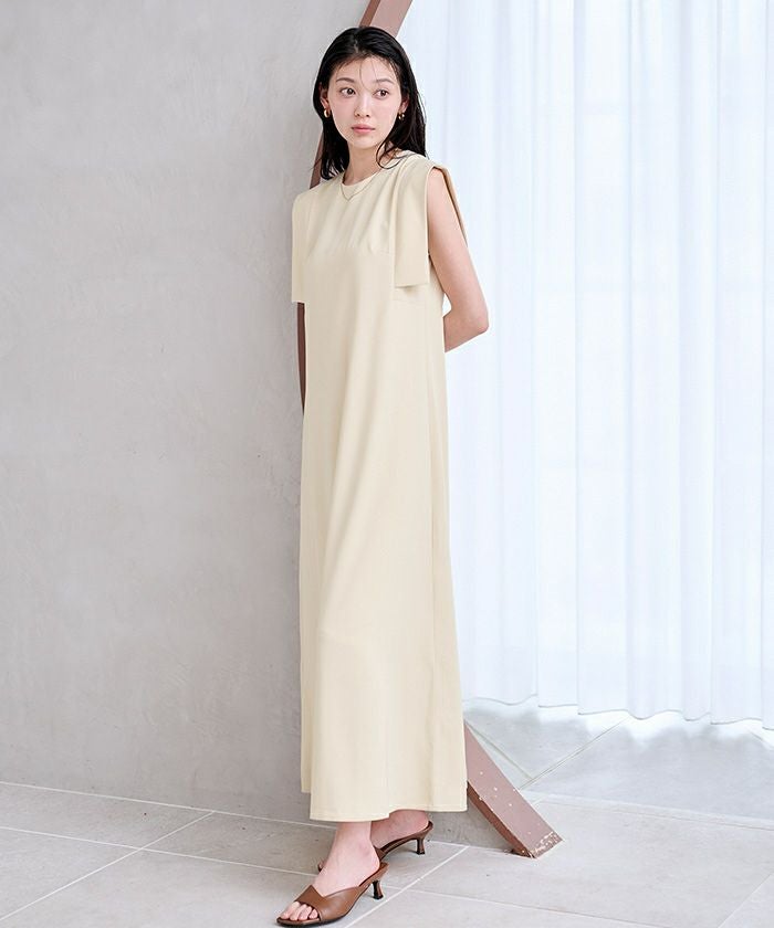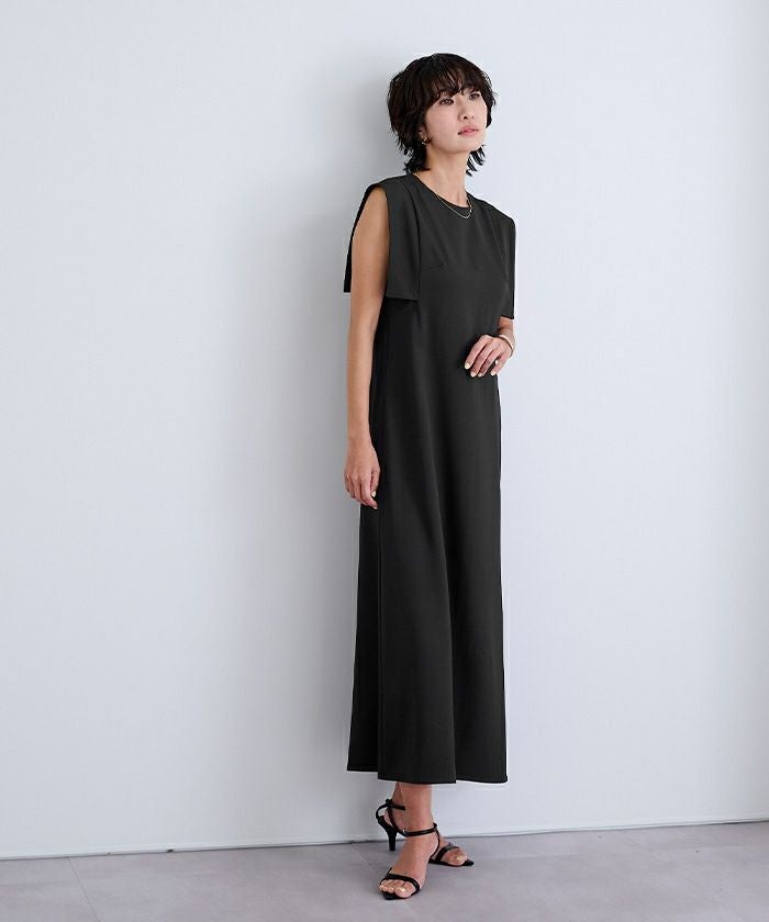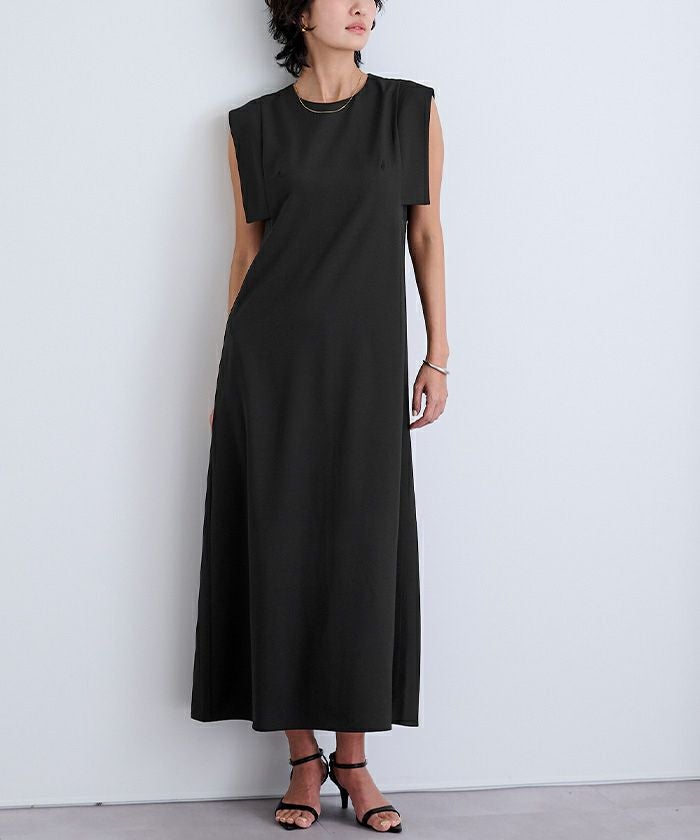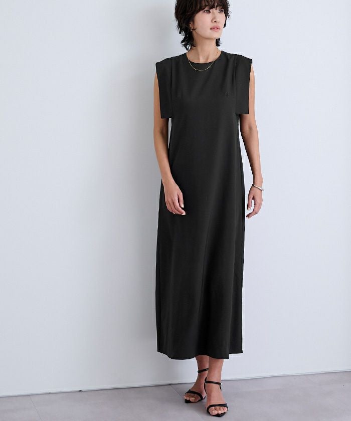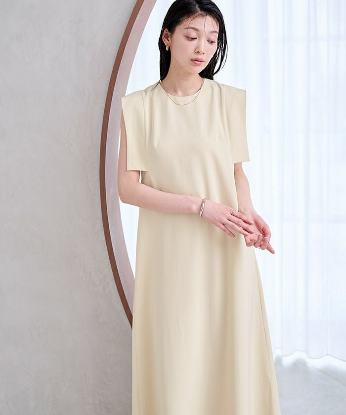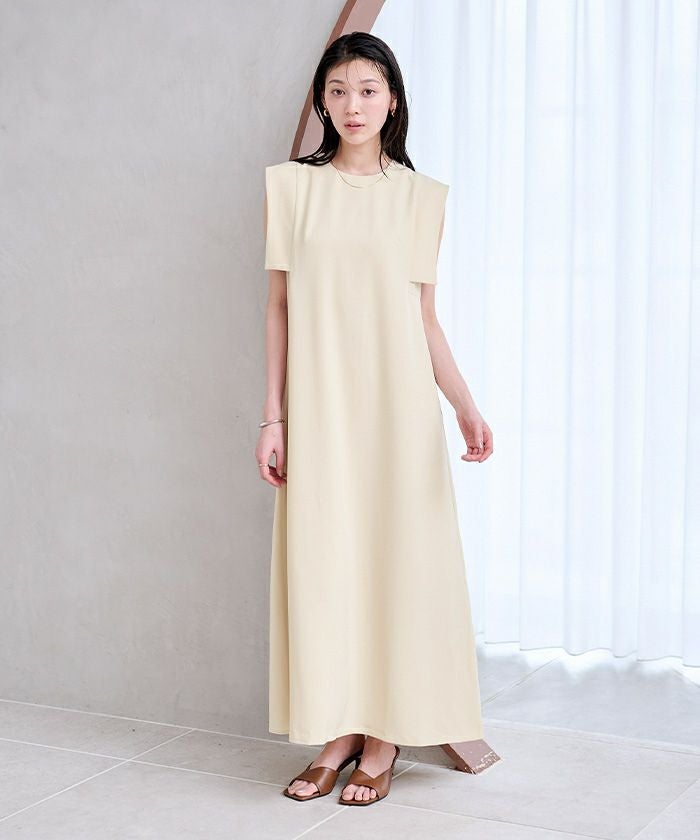 スクエアスリーブが気になる二の腕をさりげなくカバーしてくれるロングワンピース。