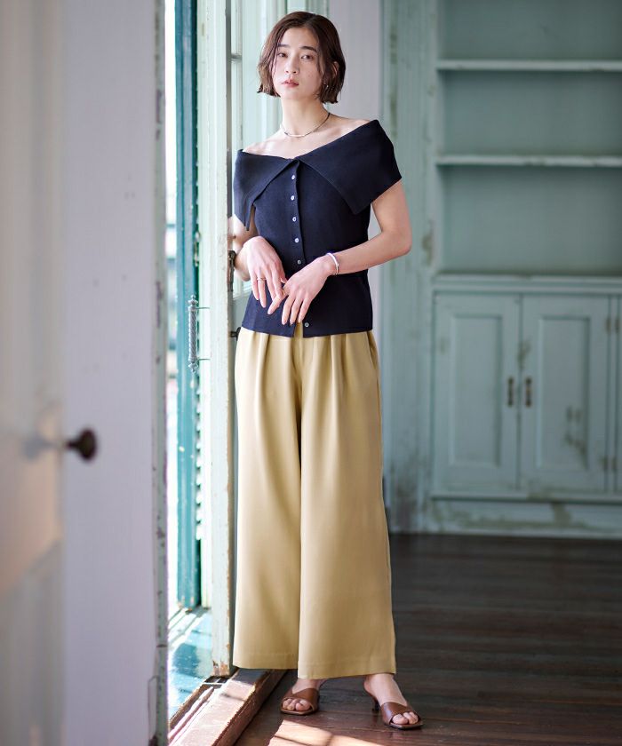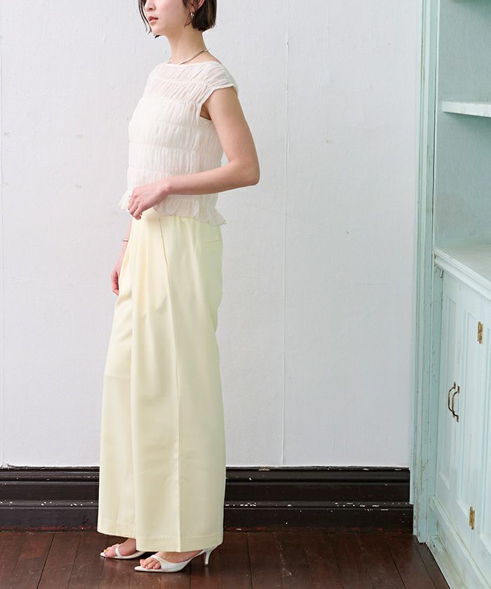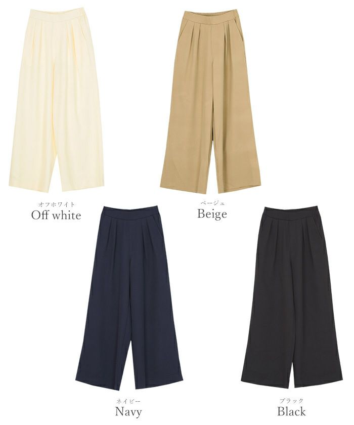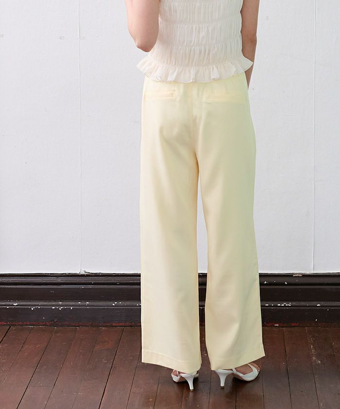フロントに入れたタックとストンと落ちるラインで、脚のラインを拾いにくく、すっきりとした印象に仕上げています。