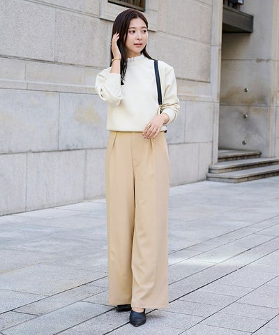 ゆとりのあるワイドシルエットで、体型をさりげなくカバーしつつも、きちんと感をキープ。