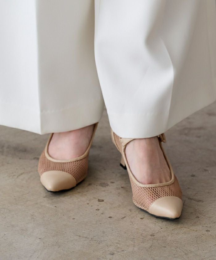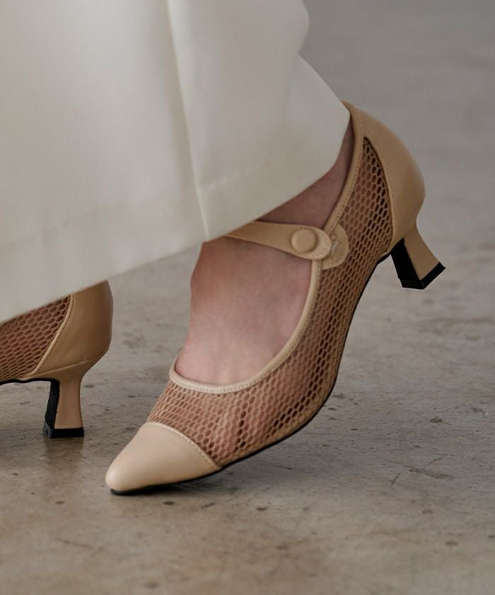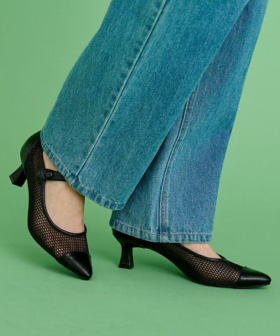 メッシュ素材の軽やかさと、レザー調のポインテッドトゥを掛け合わせた上品なパンプス。