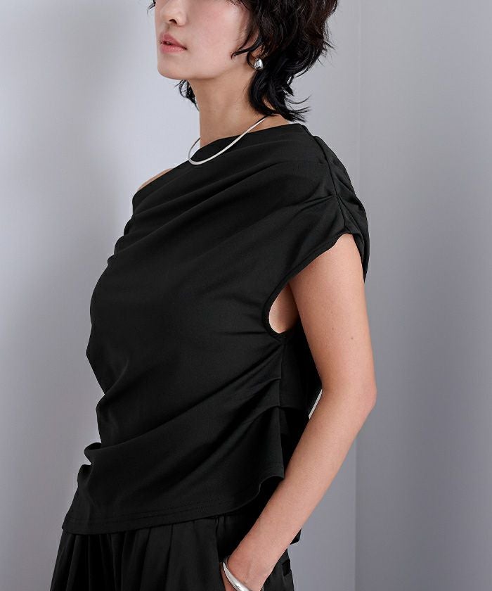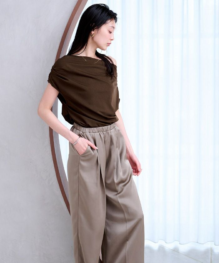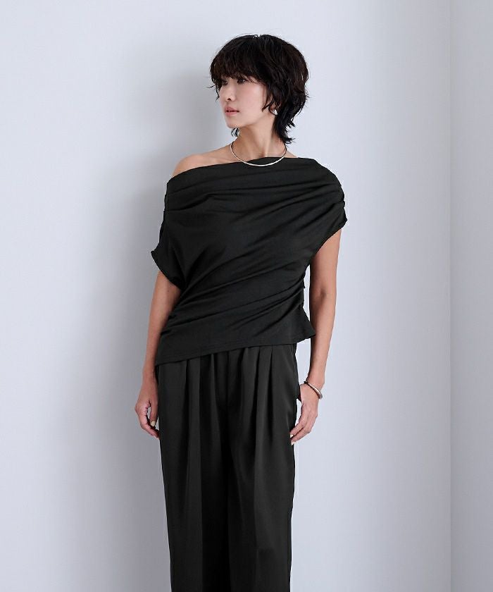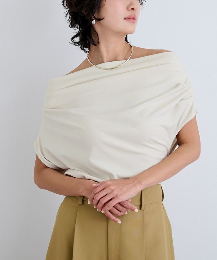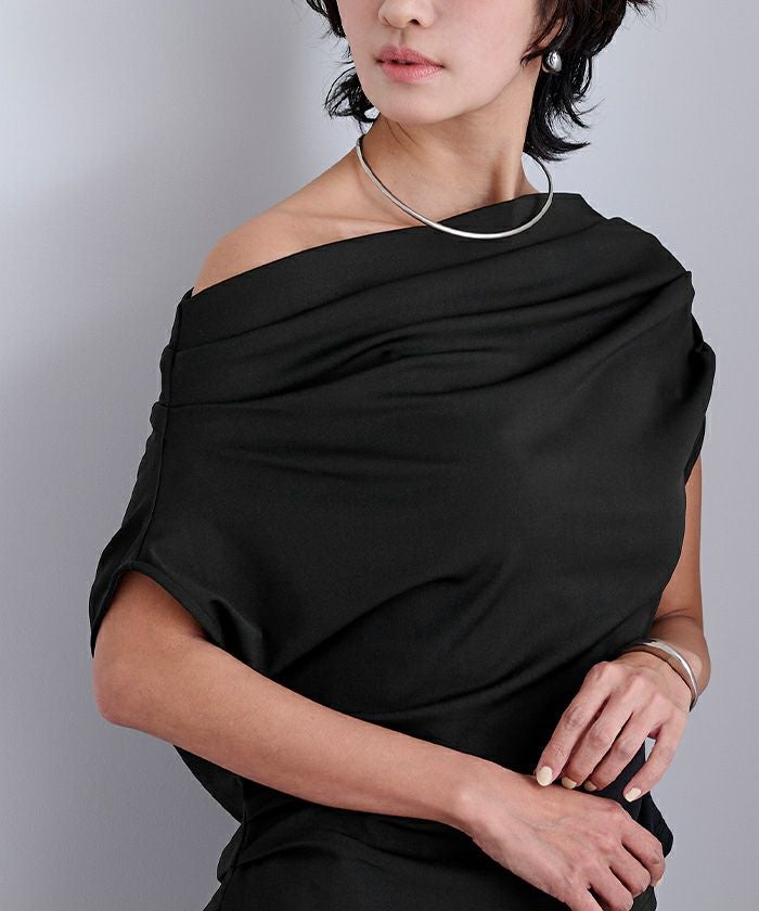 肩まわりにたっぷりと入れたドレープが動きと立体感を生み、大人の女性らしい印象に。