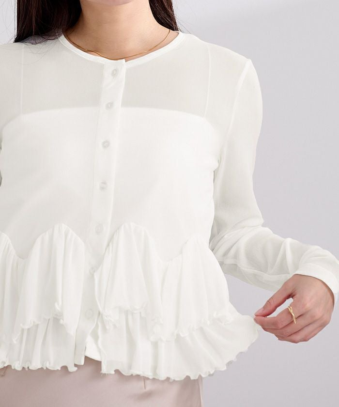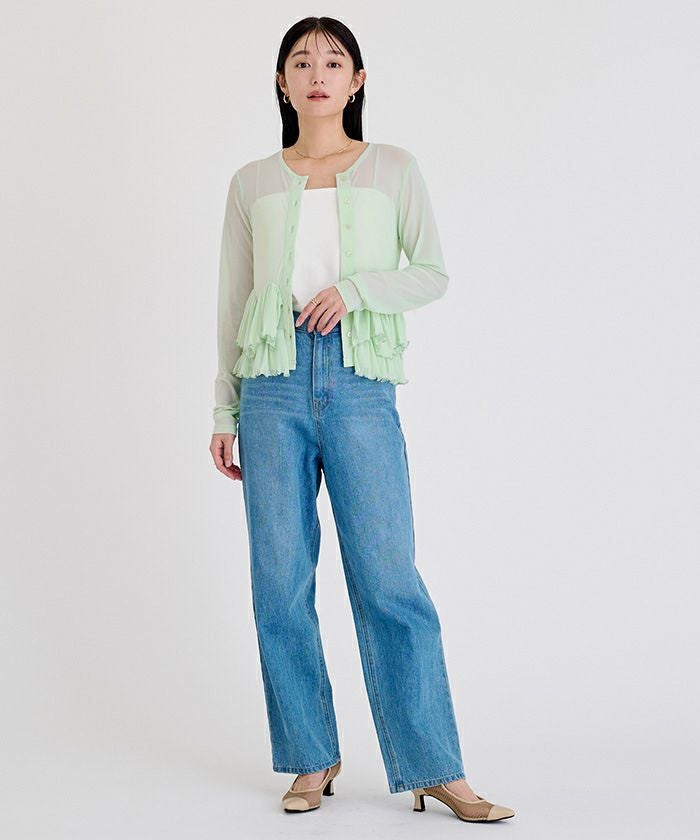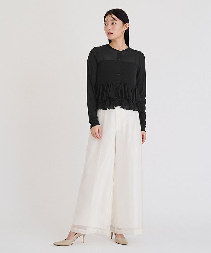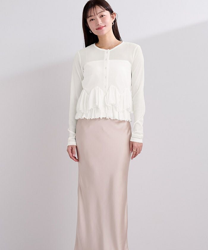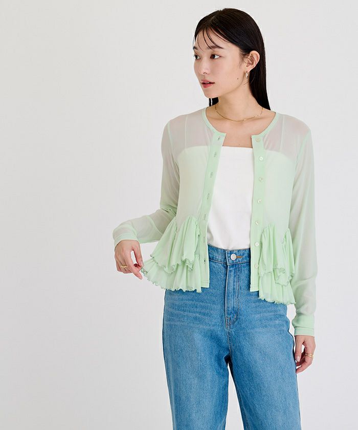 軽やかなシアー生地のフリルが目を惹くカットソーカーディガン。