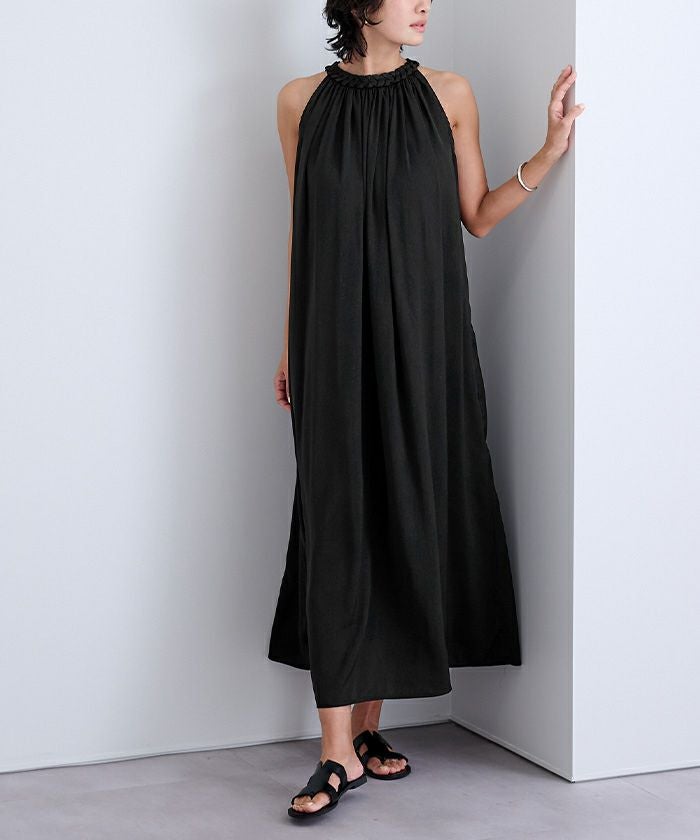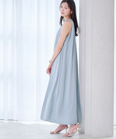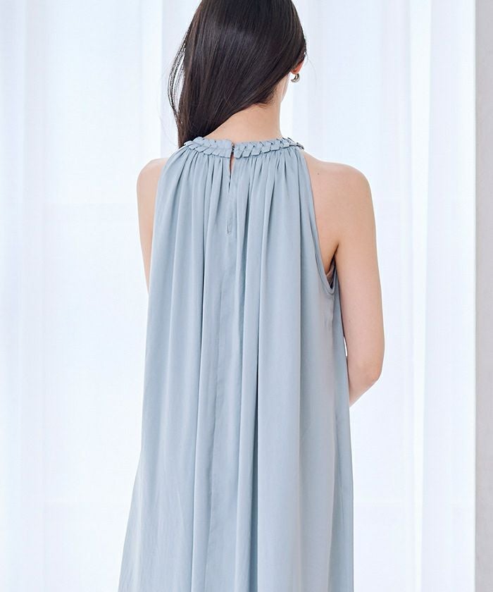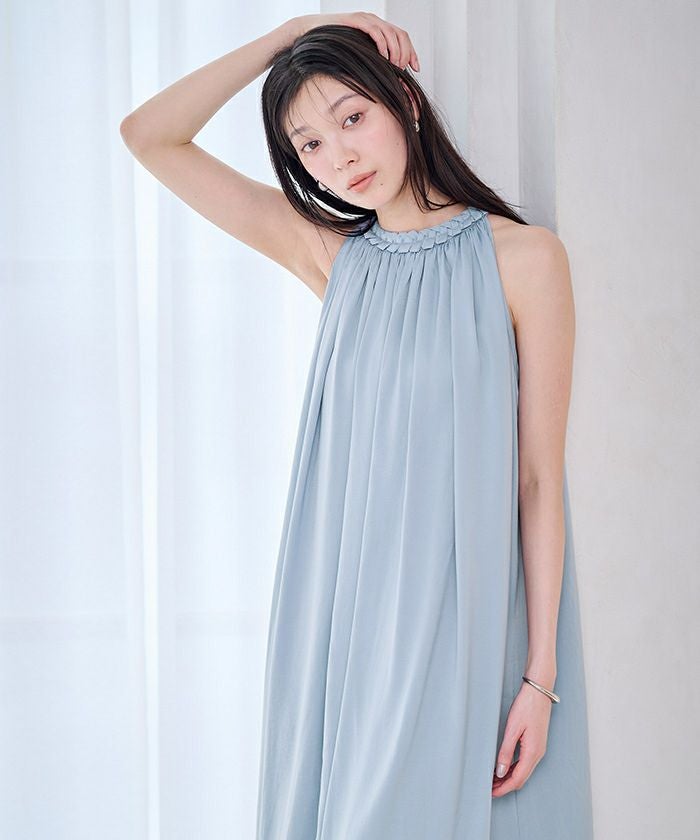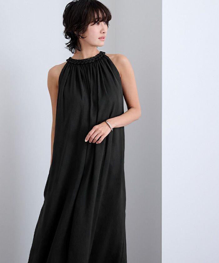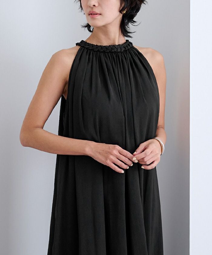 ネックラインにほどこしたコードデザインがアクセントになったボリュームワンピース。
