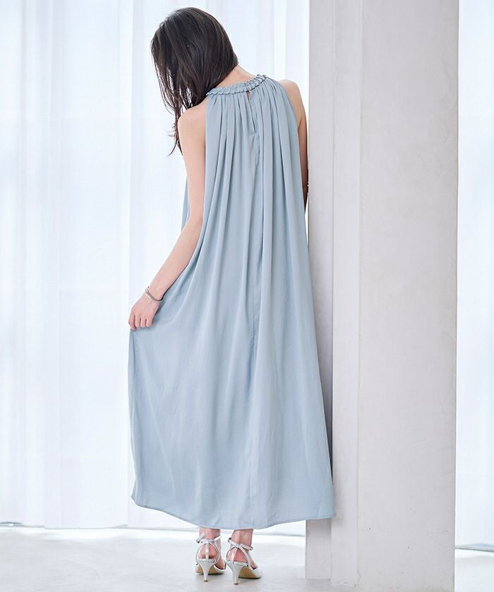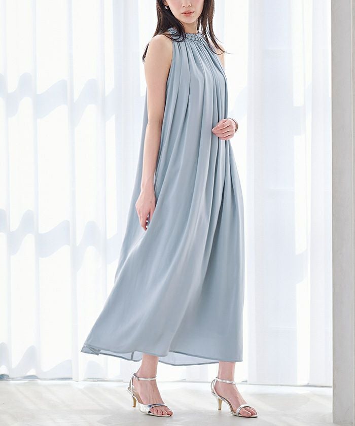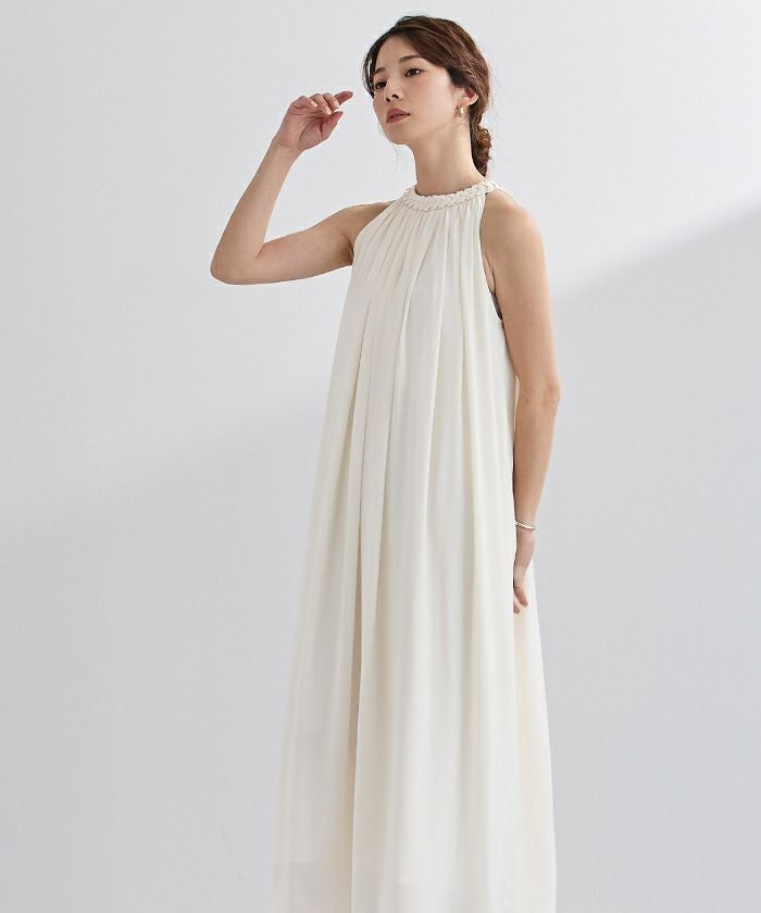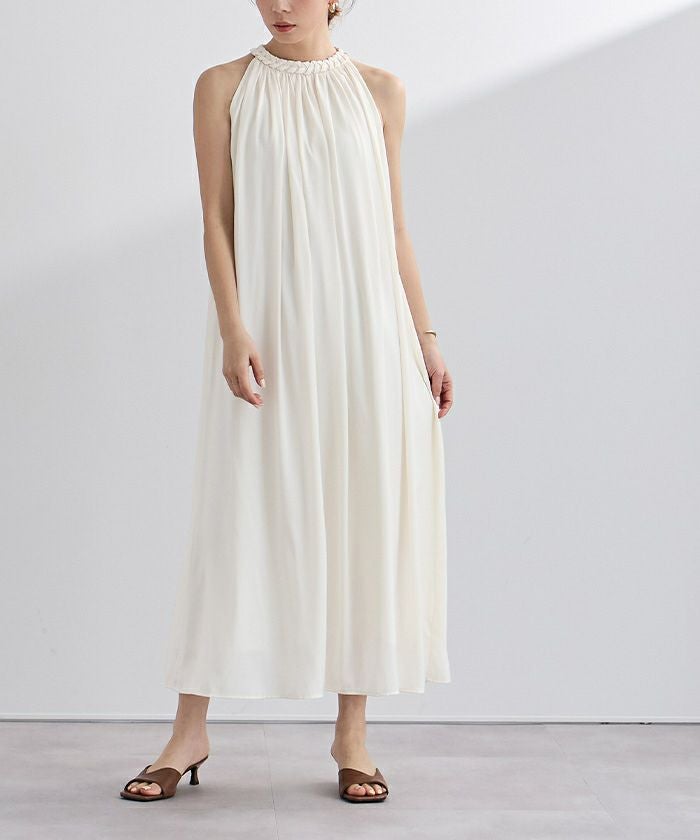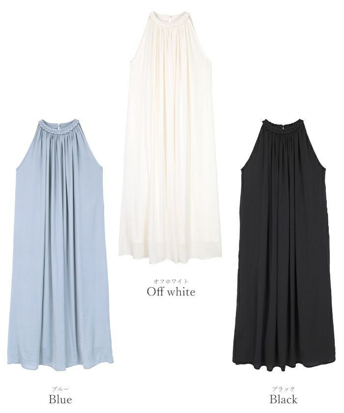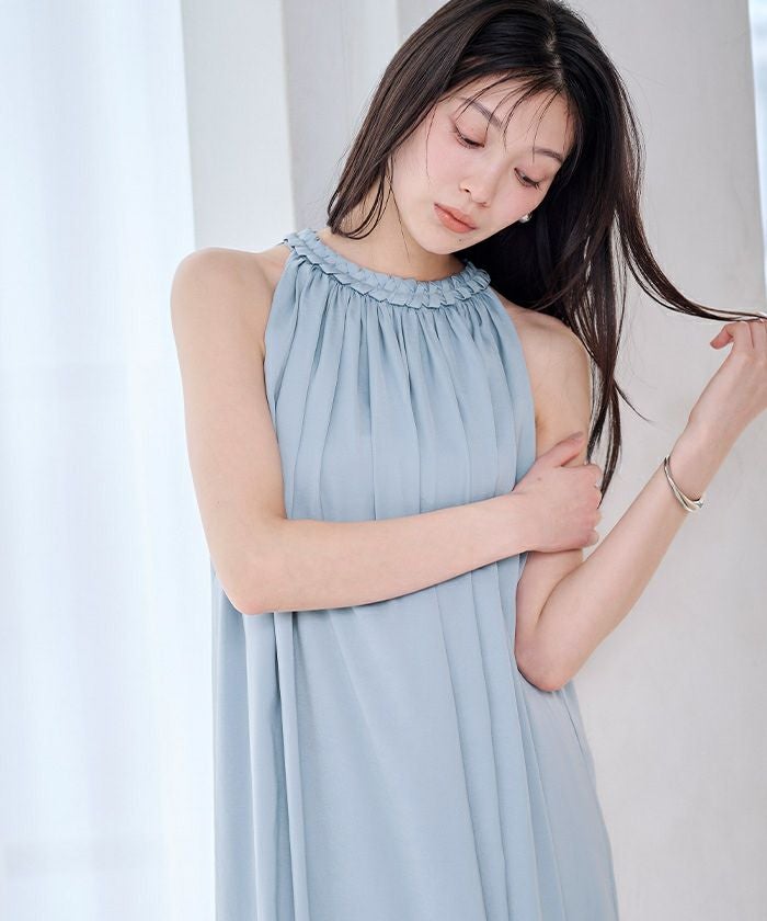 ネックラインにほどこしたコードデザインがアクセントになったボリュームワンピース。