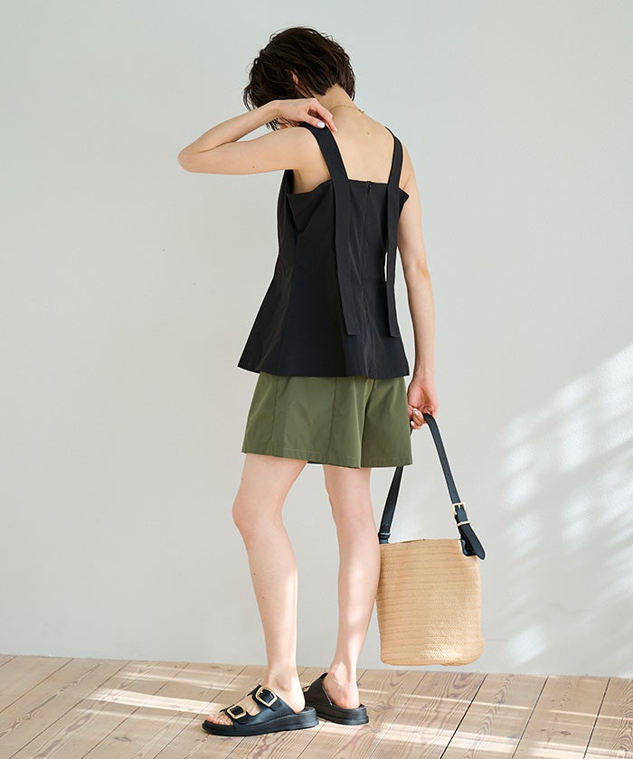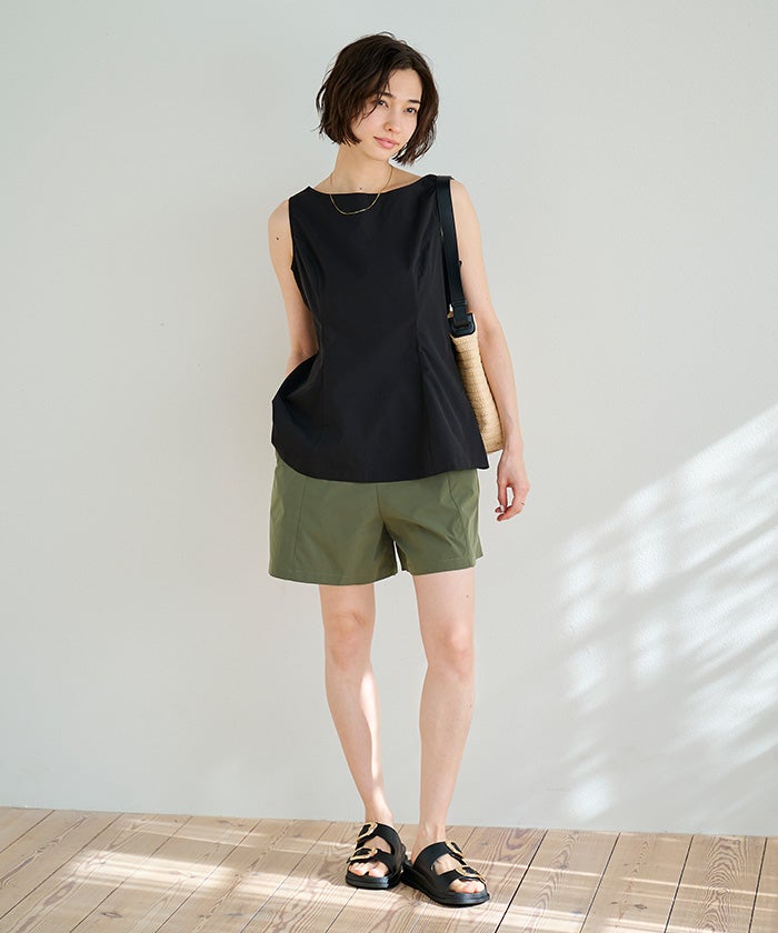 ハリ感のある素材を使用しており、ショート丈でもカジュアルになりすぎないデザインに仕上げています。