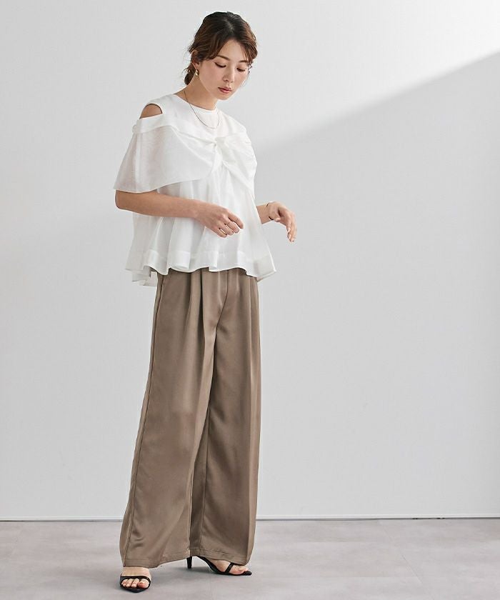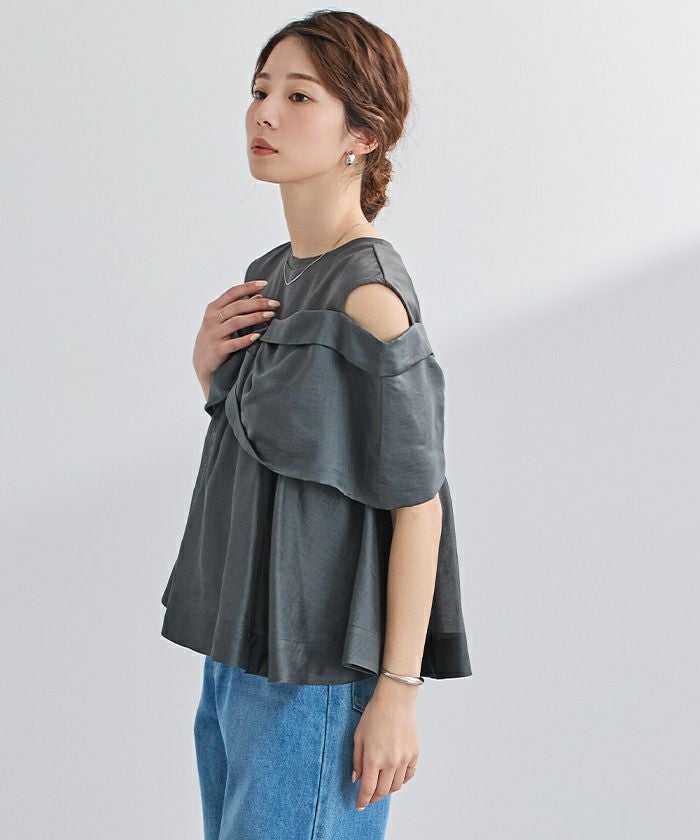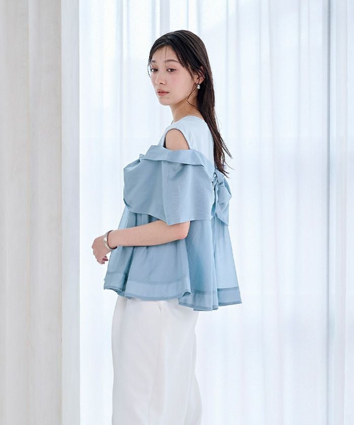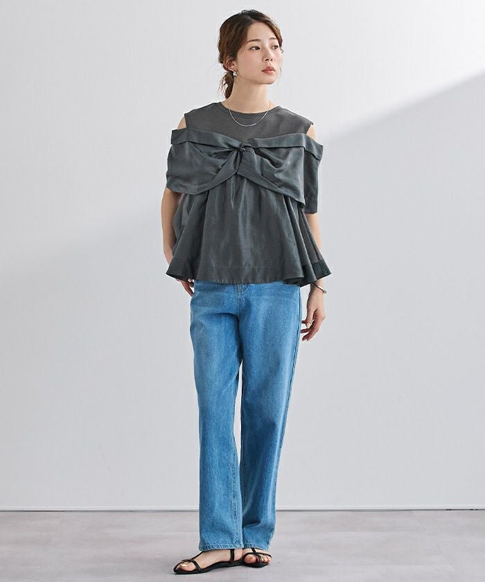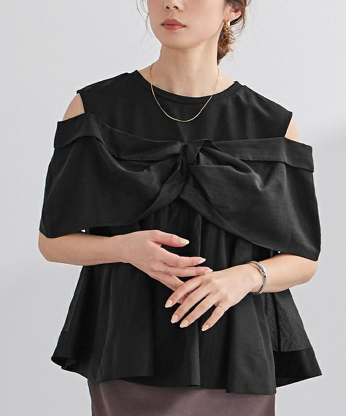 程よい肌見せを叶えるオープンショルダーデザインで、気になる二の腕まわりもカバーしてくれます〇