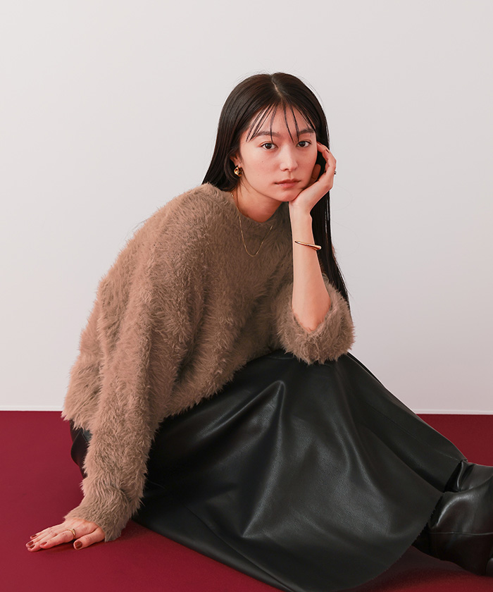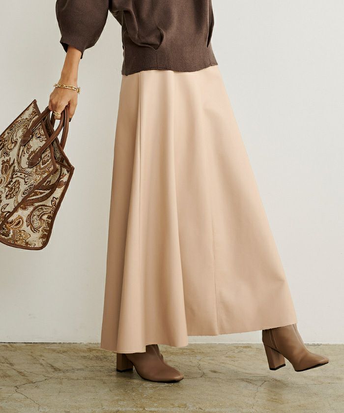 ・広がりすぎない程良いフレアが美しいシルエットを作り出すフェイクレザースカート。