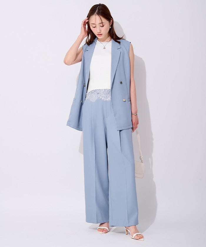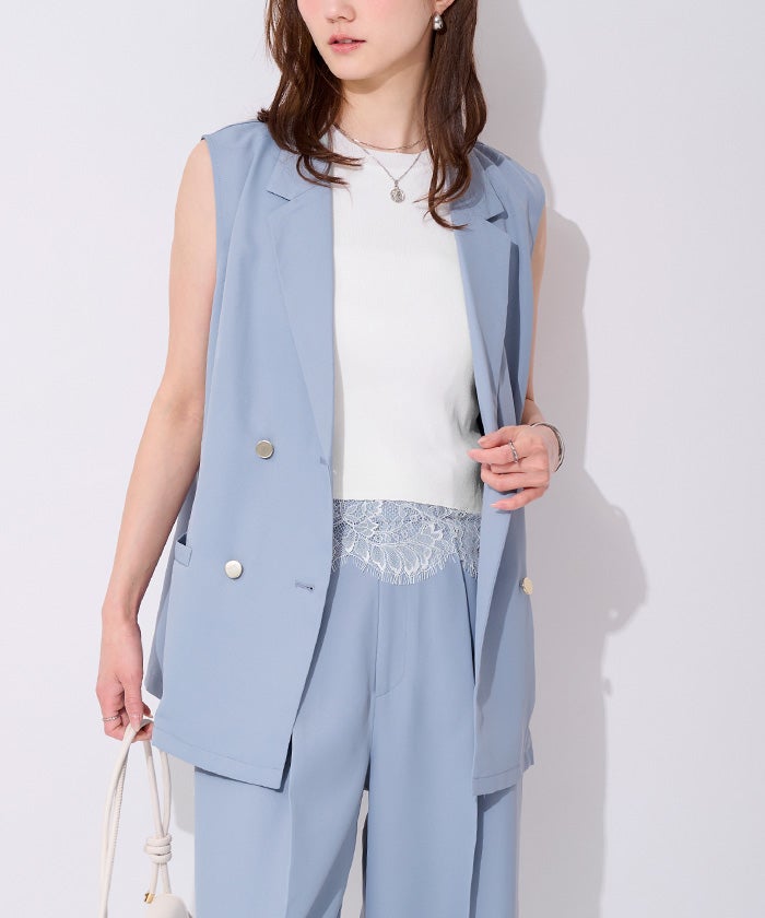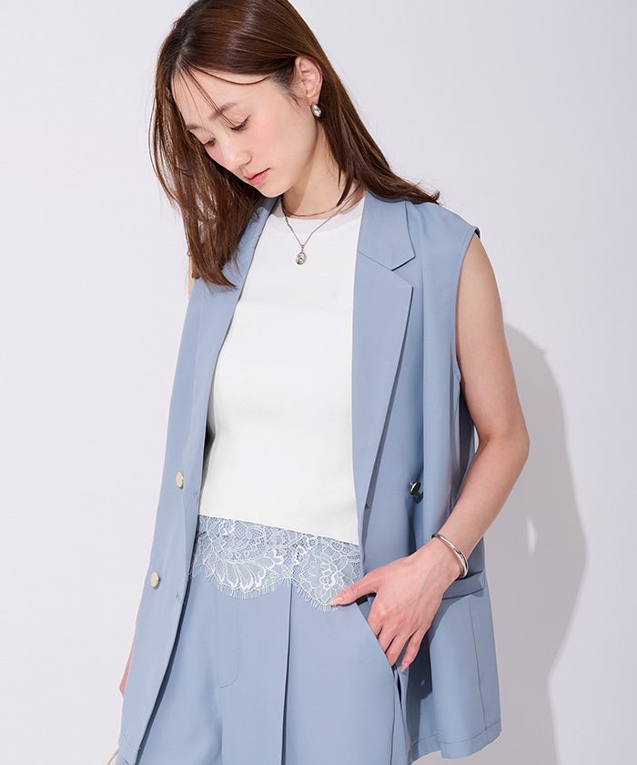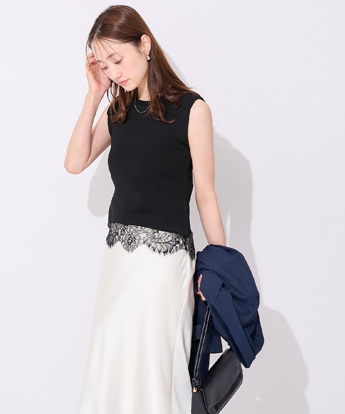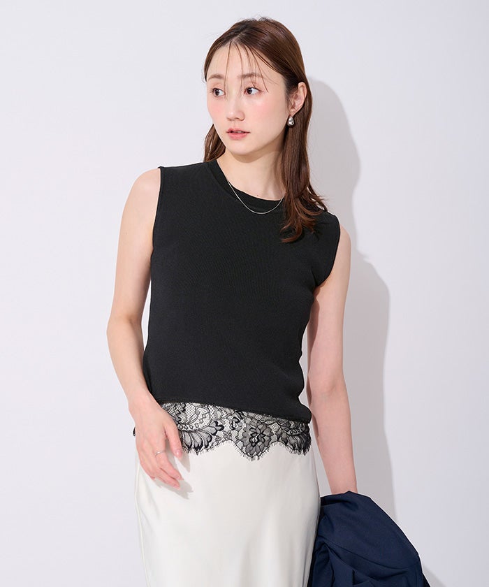 裾のレースが魅力のノースリーブリブトップス。