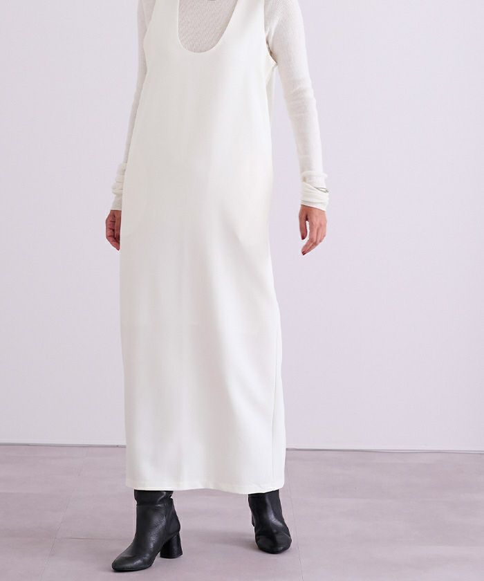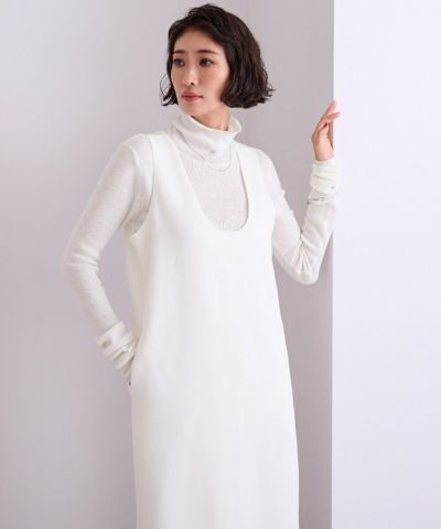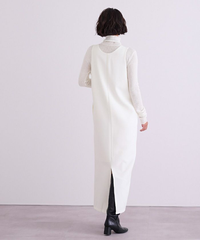 高見えする生地と、すっきり見えるIラインのデザインなところが、大人が着れるジャンスカという感じで重宝してます。Iラインということもあって、ある程度タイトなので下に分厚いものは持ってこれないです。