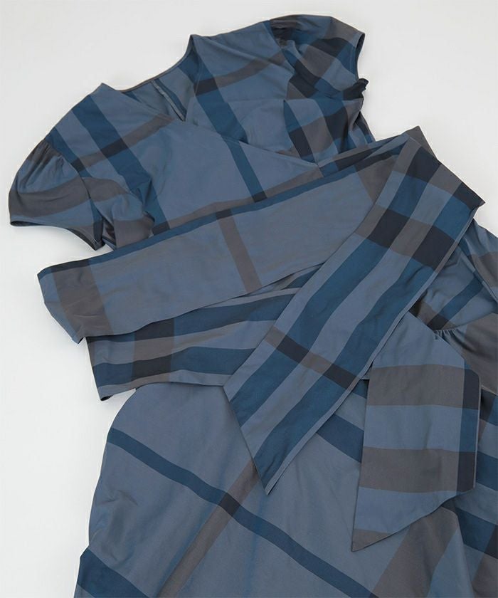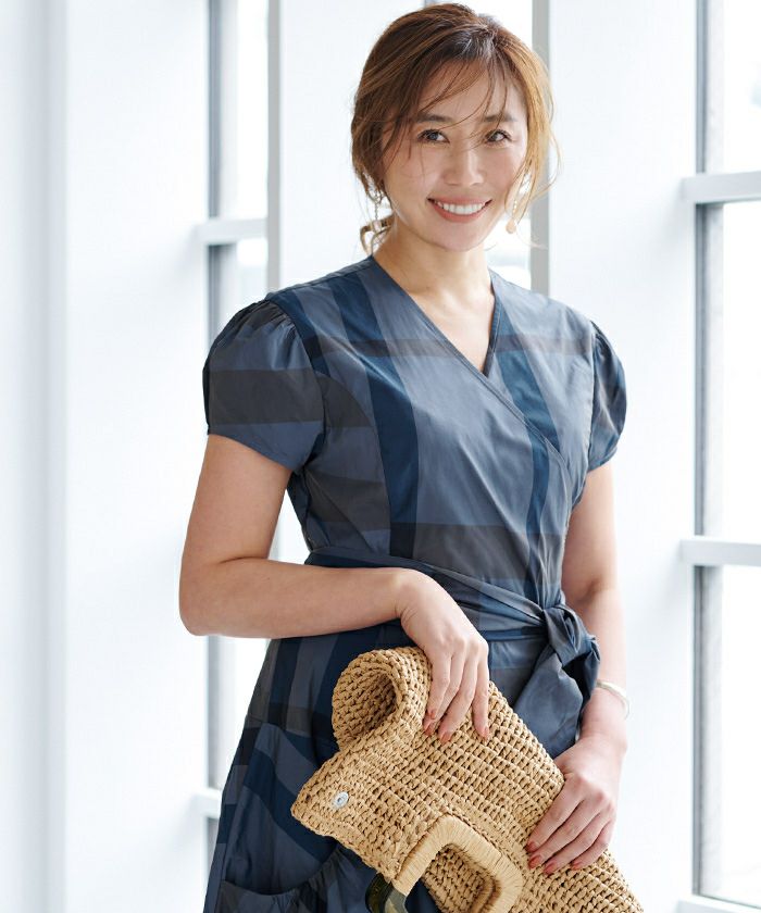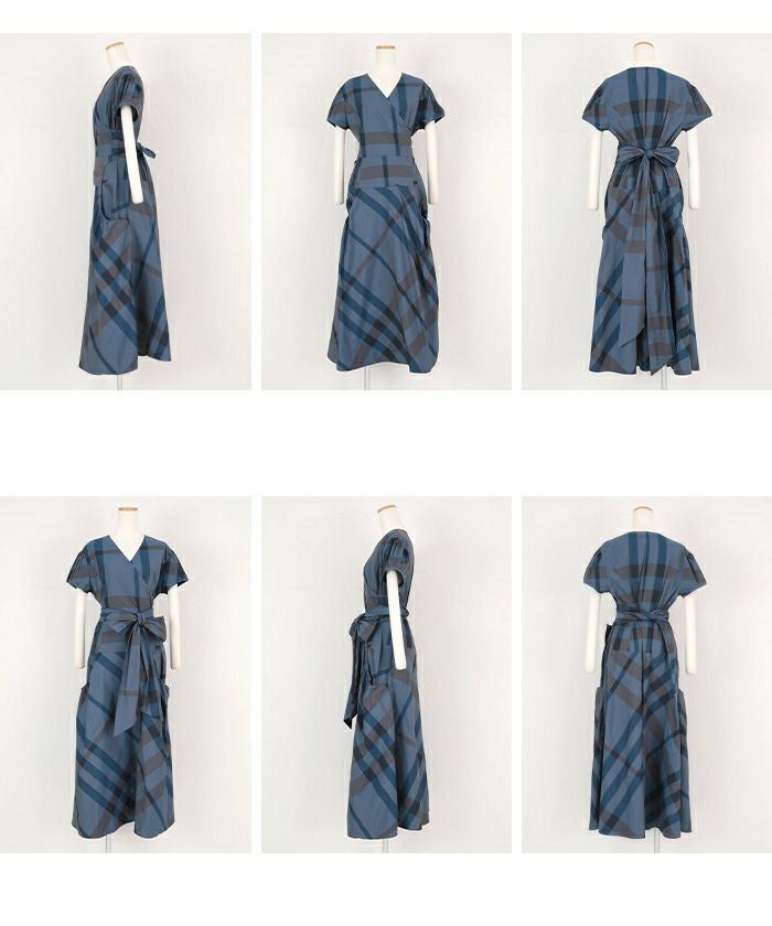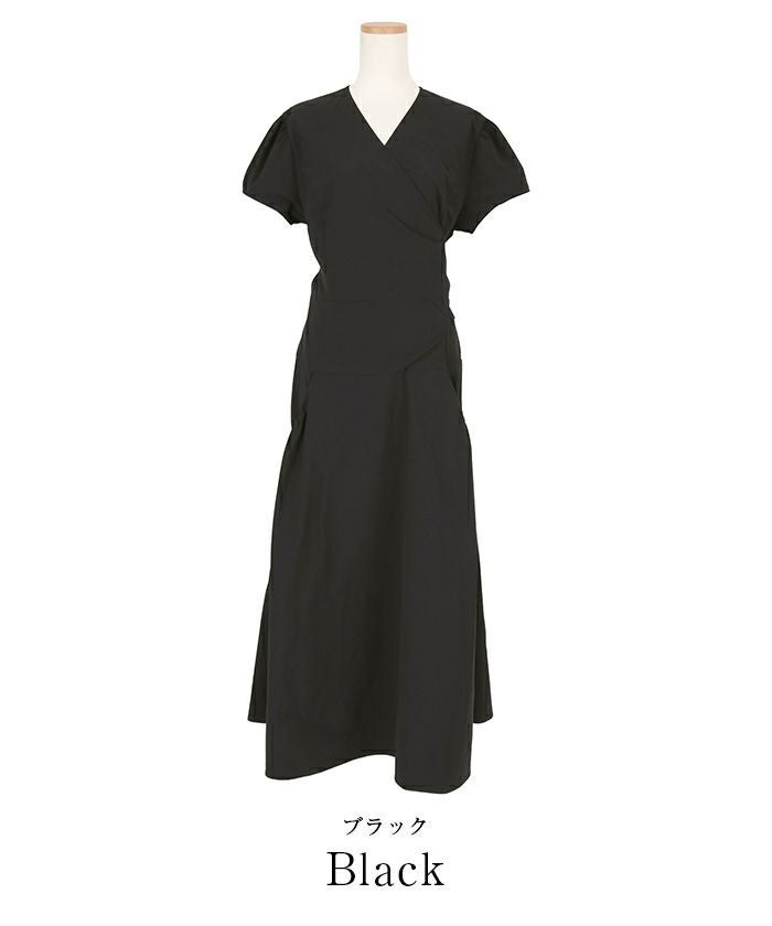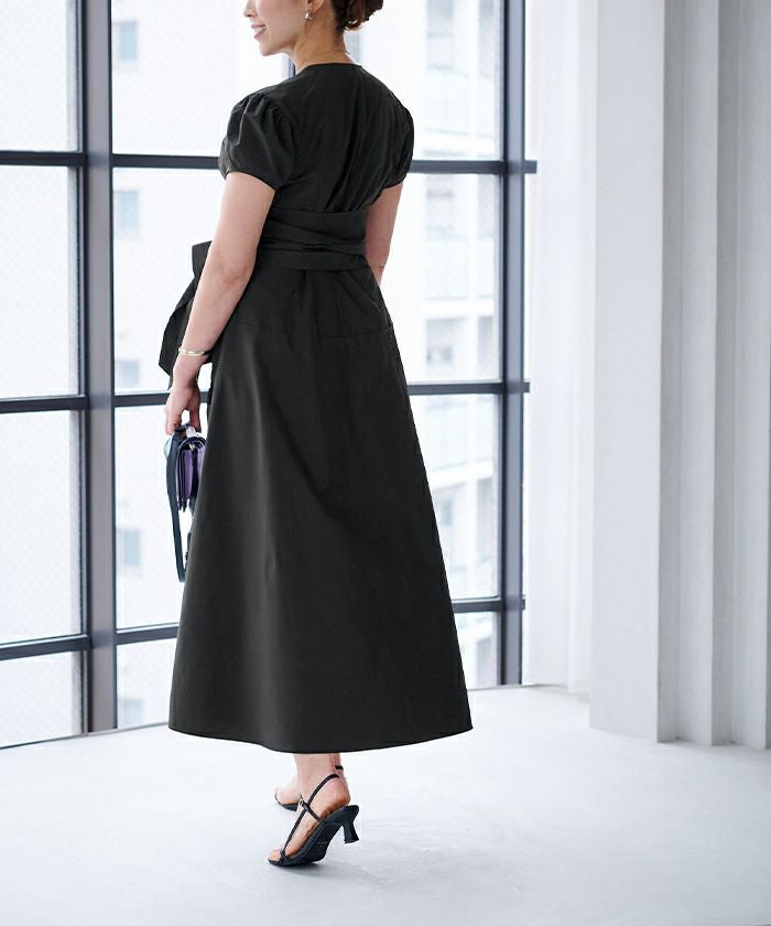 カシュクールデザインに後ろリボンで着用するとすっきりとした見え方に。