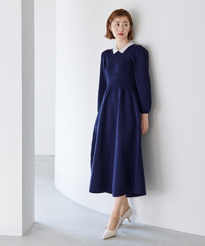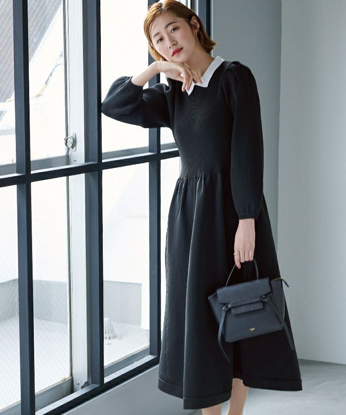 セレモニーシーンでも着やすいミモレ丈で、パンプスに合わせやすいのもポイント。